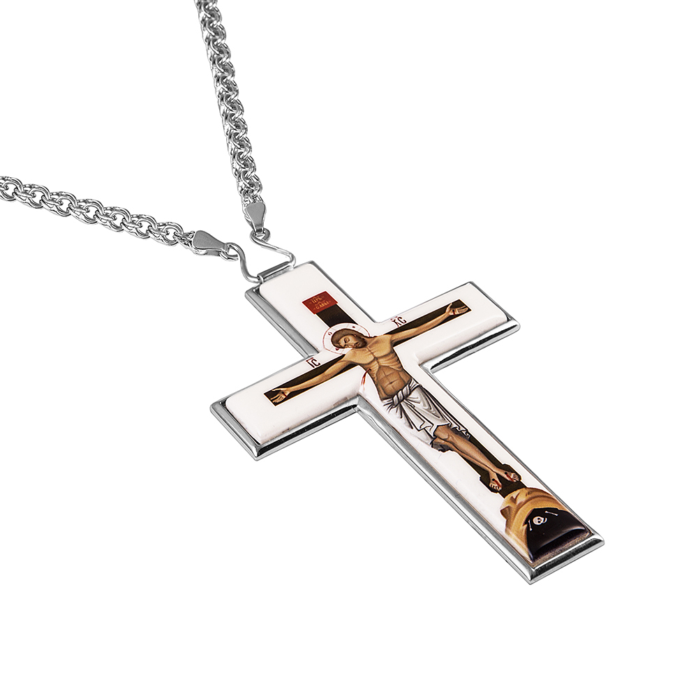 Крест наперсный из ювелирного сплава в серебрении с цепью, деколь, 7х11 см
