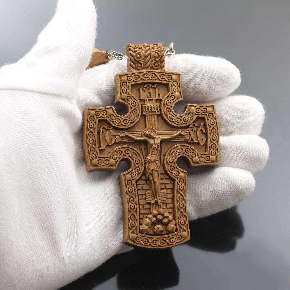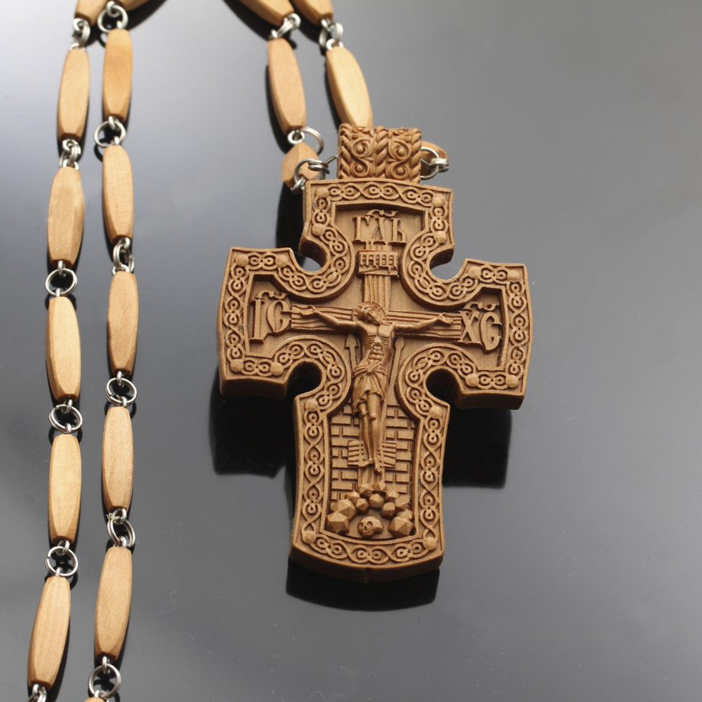 Наперсный резной крест из древесины груши предназначен для ношения в будние дни Великого поста. В центральной части помещено резное Распятие, по периметру выполнена объемная рамка. Ровные края без декора делают модель строгой, подходящей под сдержанный стиль постового облачения. Покрытие защитным лаком продлевает срок эксплуатации изделия. В комплекте предлагается надежная цепь с крупными деревянными «бусинами», скрепленными металлическими скобами.