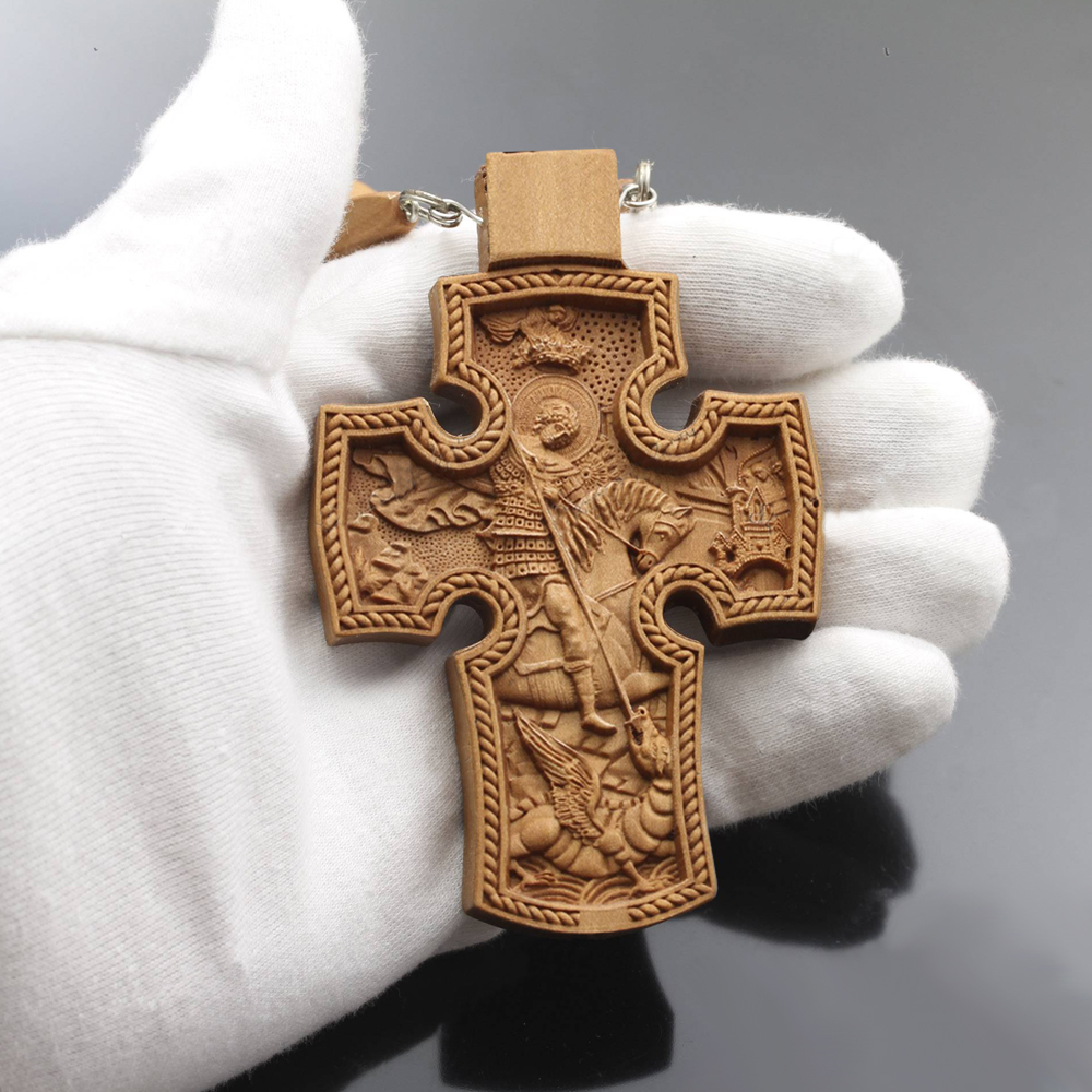 Крест наперсный "Наградной" деревянный светлый резной, с цепью, высота 10 см фото 4