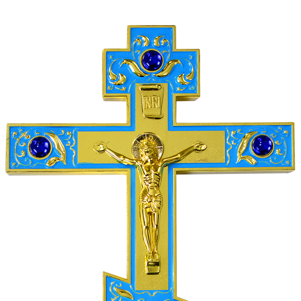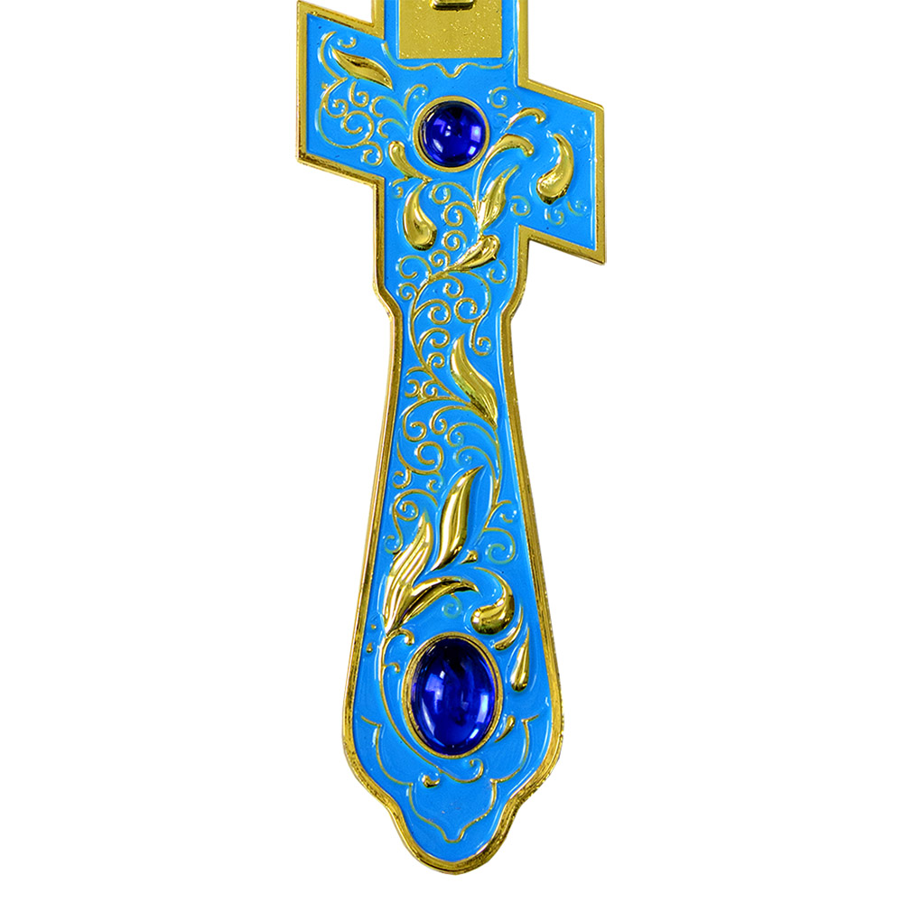 Крест напрестольный / требный, цинковый сплав, голубая эмаль, синие камни, 14,5х26 см