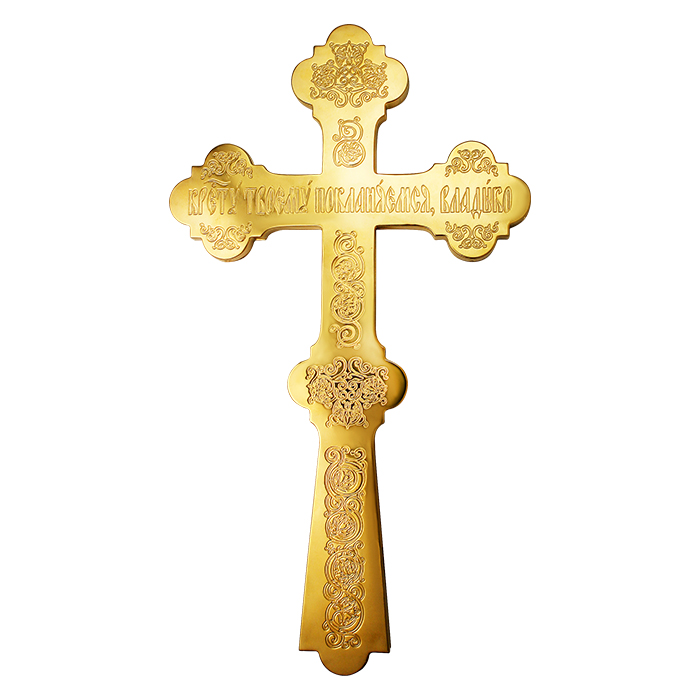 Напрестольный крест изготовлен из ювелирного сплава и покрыт тонким слоем золота гальваническим способом. Такой способ нанесения золота гарантирует долговечность покрытия и простоту в уходе. Образа и Распятие выполнены по специальной технологии нанесения цветного изображения на латунную основу и покрыты составом, предохраняющим их от механических повреждений и воздействия света. Крест реализуется в презентабельной кожвиниловой упаковке с бархатным ложементом.