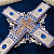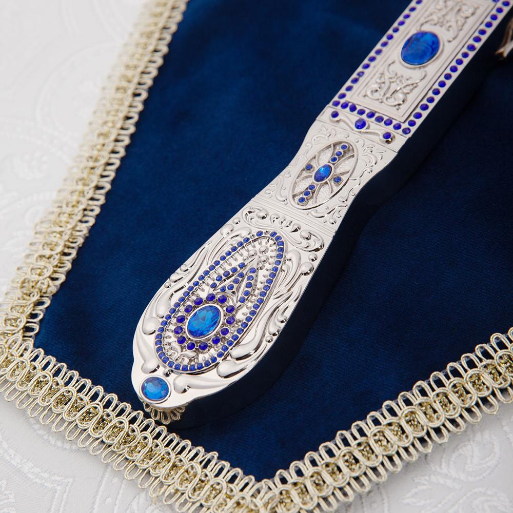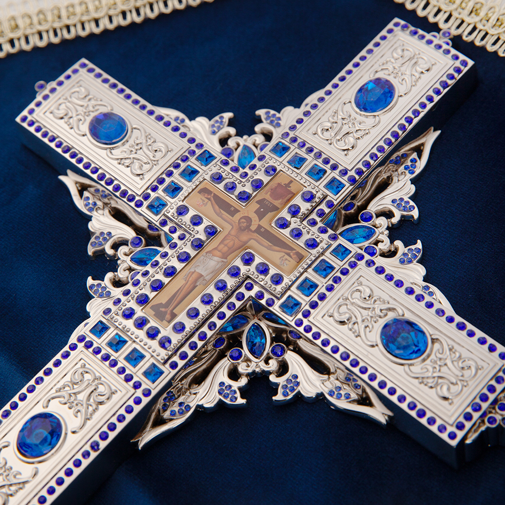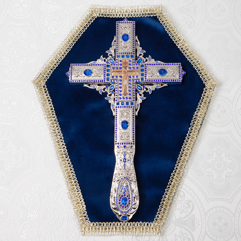 Напрестольный / требный крест из цинкового сплава с отделкой синими камнями.