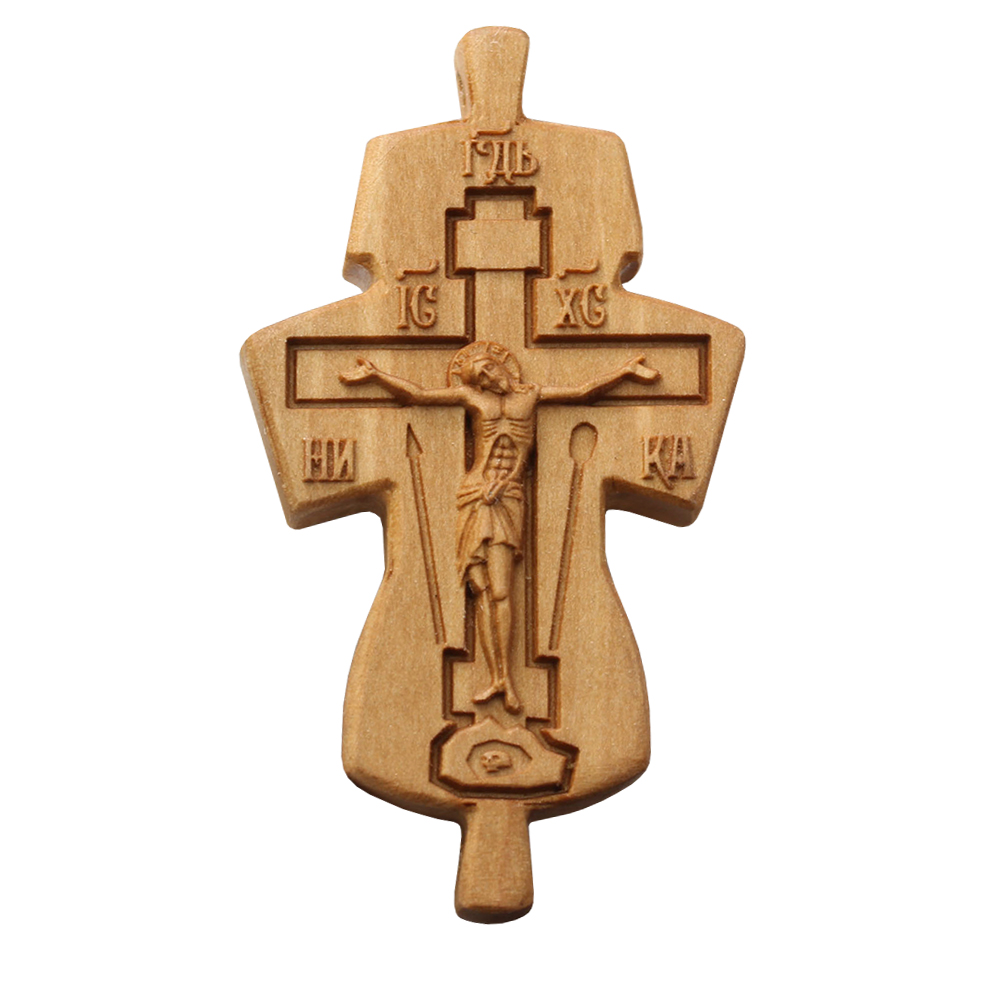 Параманный крест изготовлен из древесины груши. Модель выполнена в форме четырехконечного креста с небольшими выступами в верхней и нижней части под шнуры парамана. Изделие имеет ровную полированную поверхность, в центральной части помещено объемное изображение Распятия на фоне контуров восьмиконечного креста, вырезанного в толще материала. На обратной стороне имеется надпись «Спаси и сохрани». В числе достоинств модели – сдержанный аскетичный вид за счет традиционной формы и отсутствия декоративных элементов.