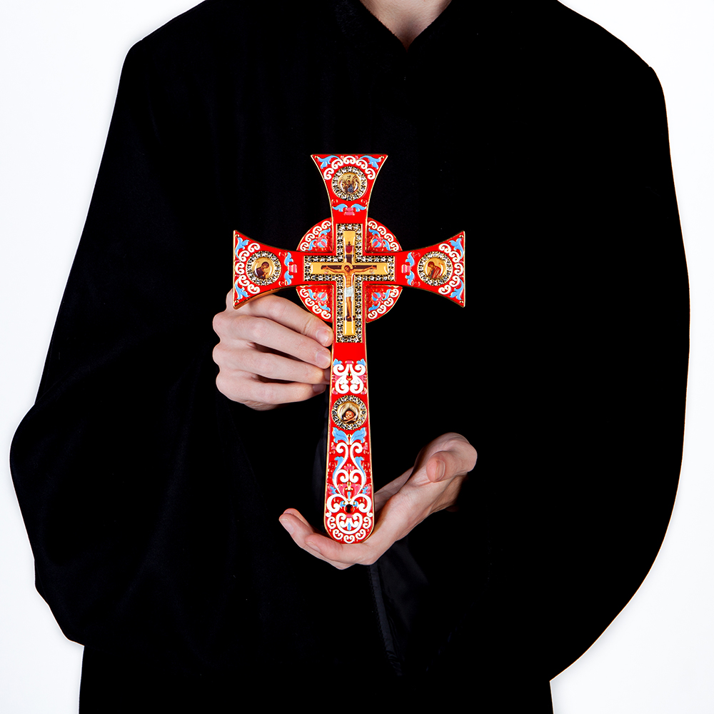 Крест напрестольный / требный четырехконечный, цинковый сплав, красная эмаль, 17х29 см фото 10