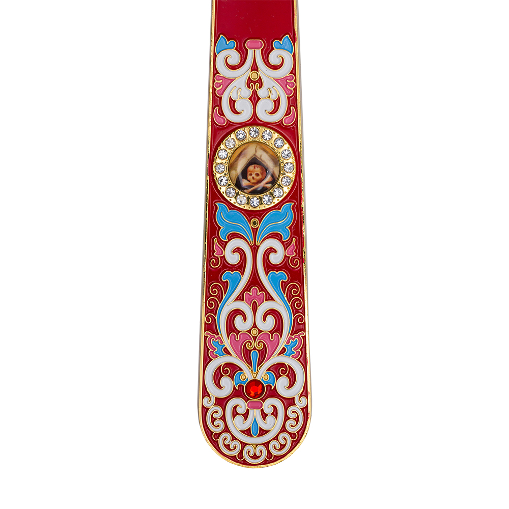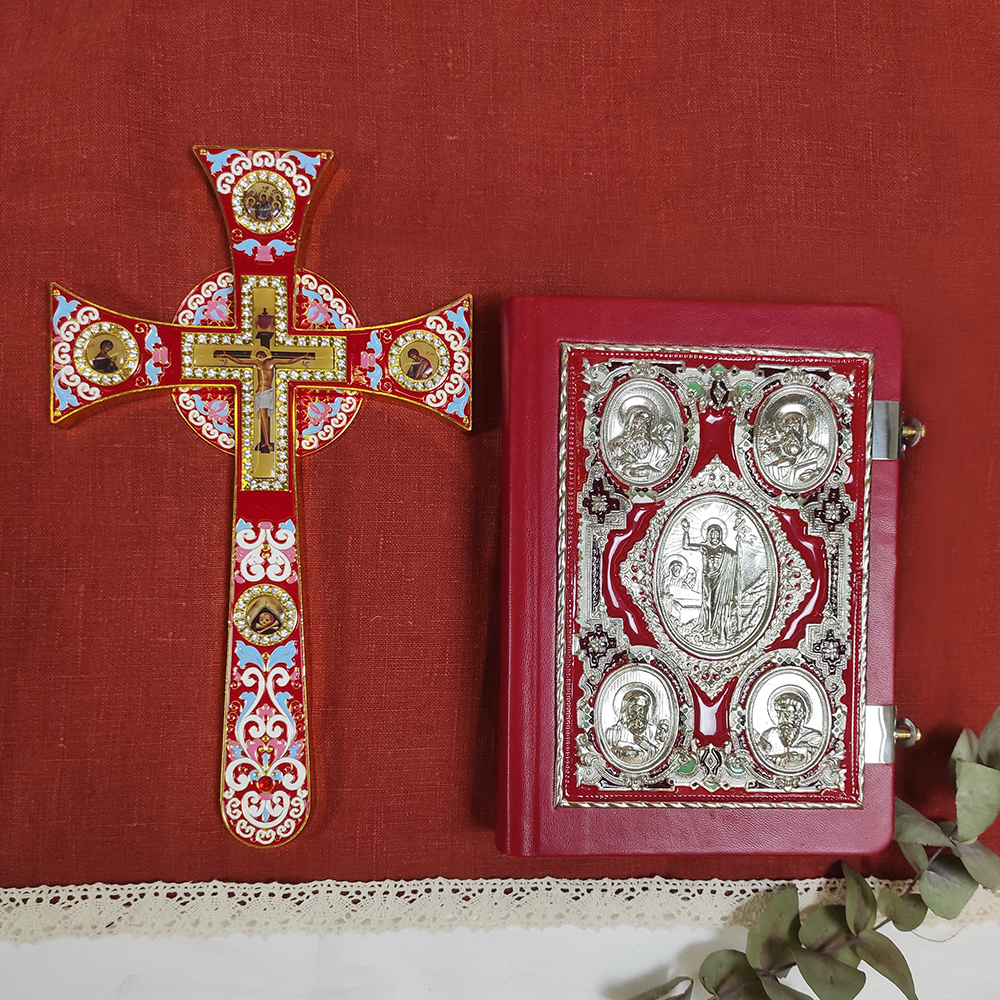 Напрестольный / требный четырехконечный крест изготовлен из цинкового сплава. Его главным украшением является цветная эмаль, которая покрывает значительную часть поверхности и подчеркивает оригинальные узоры на перекладинах. Распятие и иконописные изображения помещены в тонкие рельефные рамки, украшенные вставками из декоративных камней. Можно заказать крест на подставке или без нее, укажите желаемый вариант при оформлении заказа.
