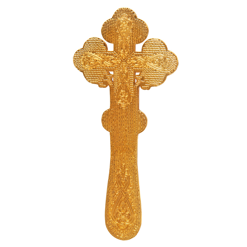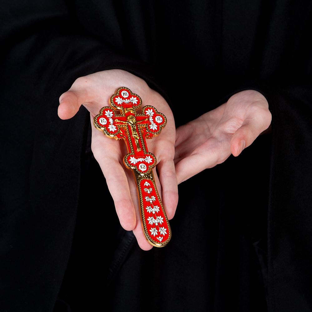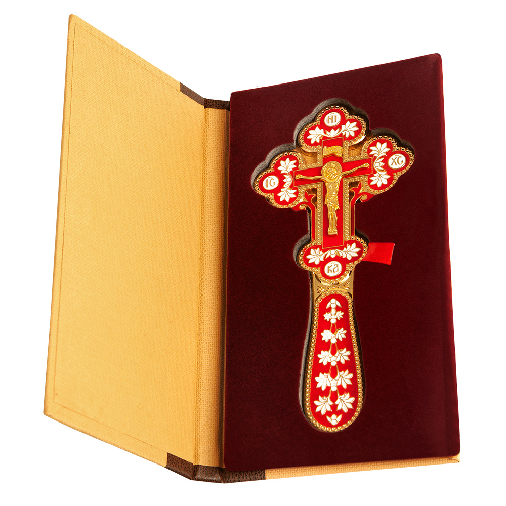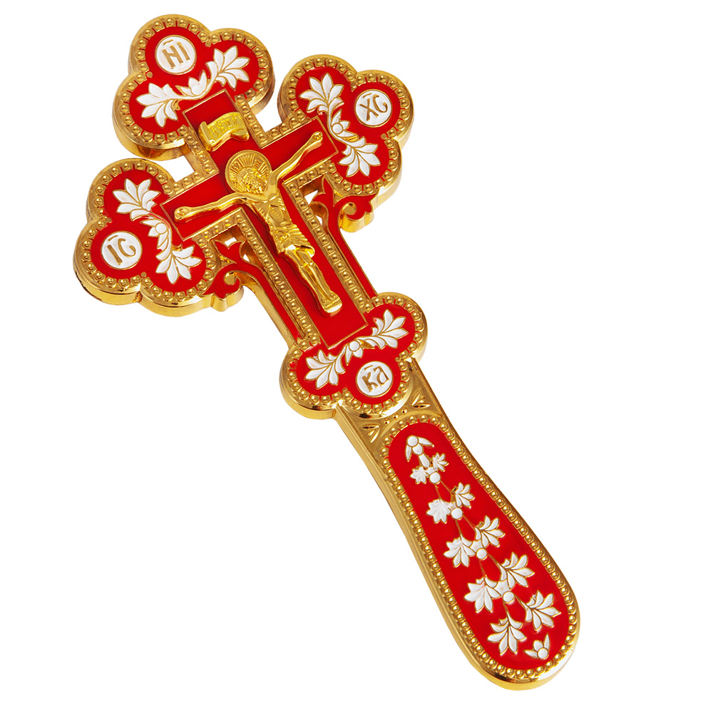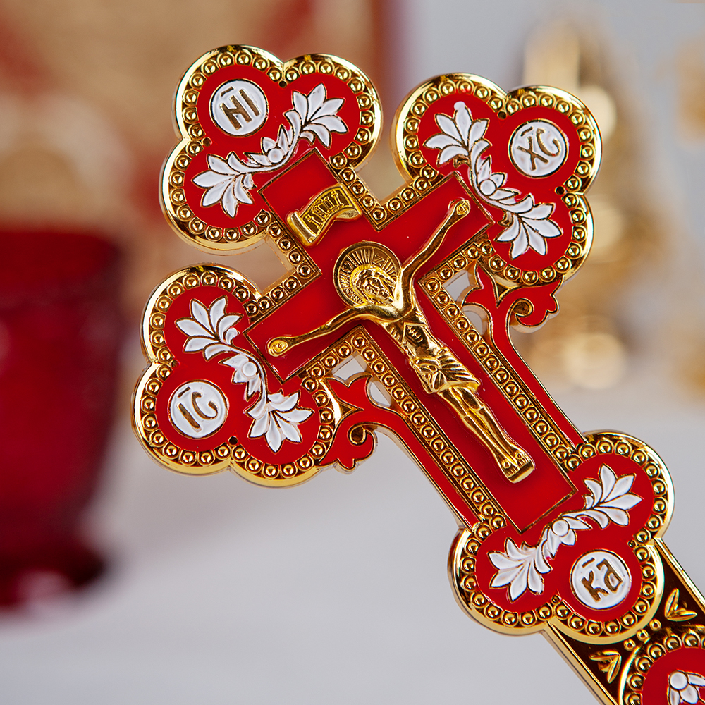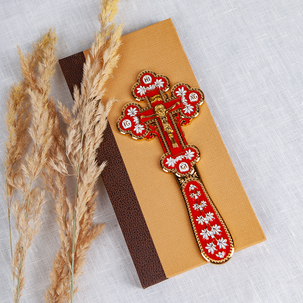 Напрестольный / требный крест изготовлен из цинкового сплава. Его средняя часть заполнена красной эмалью, а рельефные узоры выделены эмалью белого цвета. Благодаря компактным размерам и небольшому весу крест легко помещается на небольшом аналое и не вызывает затруднений при перевозке.