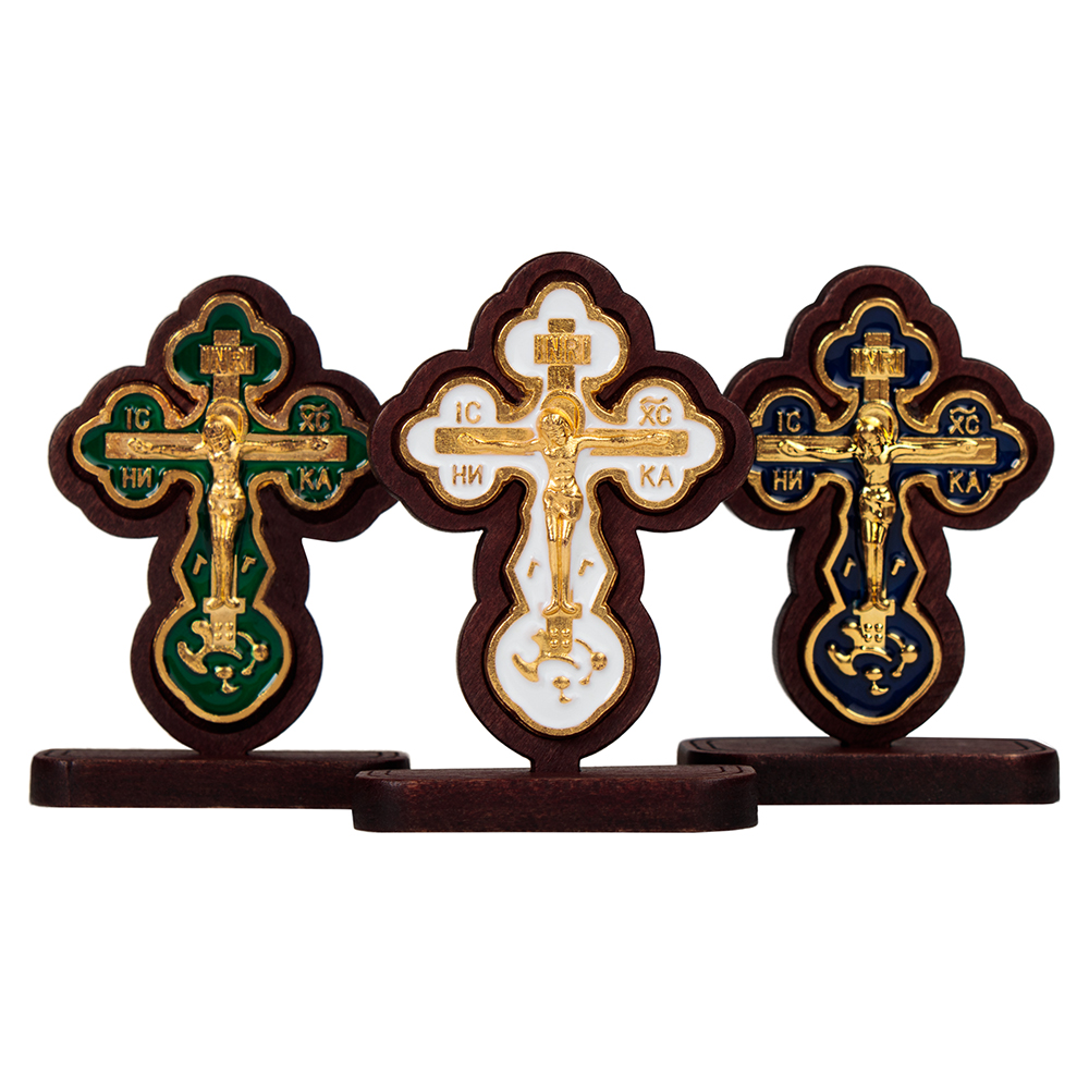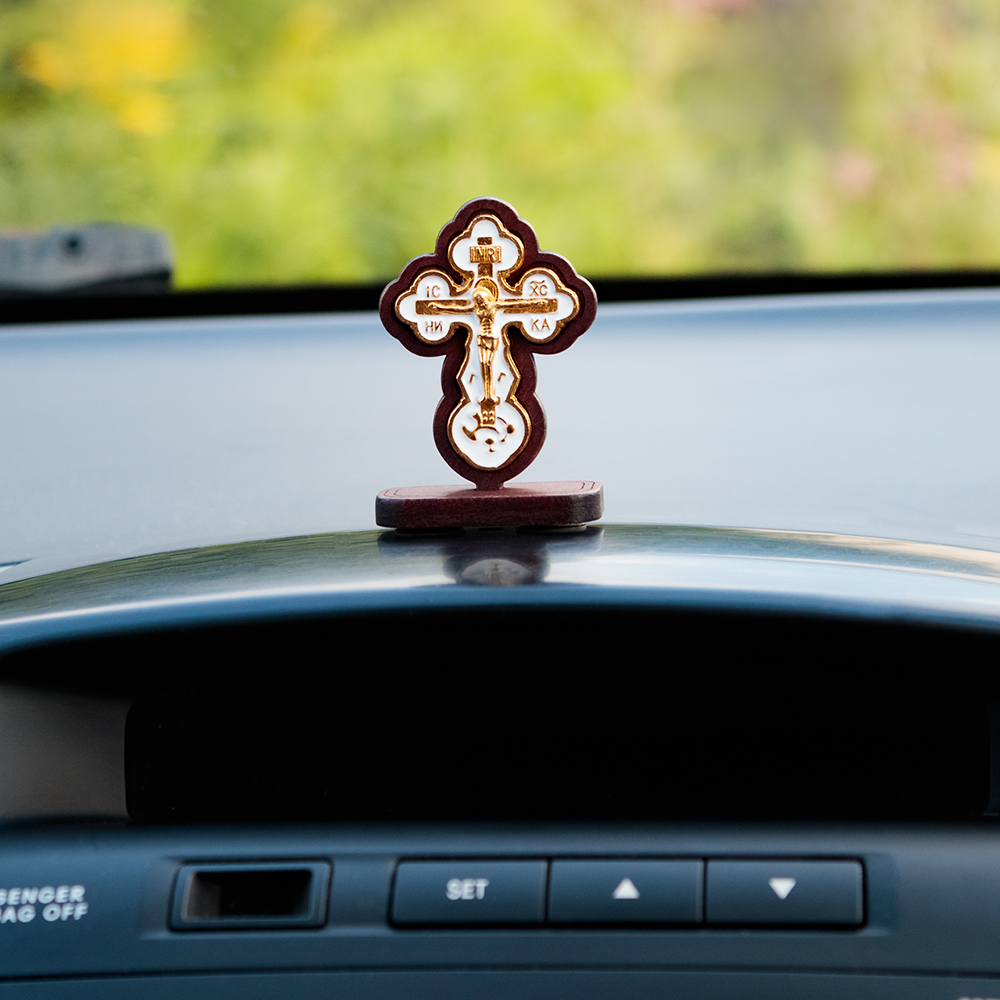Крест в автомобиль изготовлен из натуральной древесины и металлического сплава. Изображение Распятия выполнено на металле, выделено с помощью цветной эмали и помещено в "рамку" из дерева. Для устойчивости крест установлен на небольшую деревянную подставку, на обратной стороне которой закреплен двусторонний скотч.