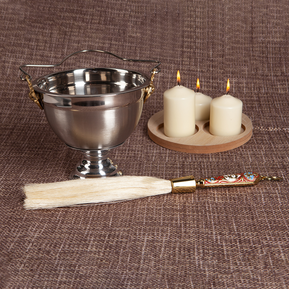 Ручка кропила изготовлена из стойкого цинкового сплава и украшена оригинальным узором. Его объем дополнительно подчеркивает покрытие цветной эмалью. Искусственный ворс не требует тщательной сушки после использования, не слеживается и длительное время сохраняет первоначальный вид.