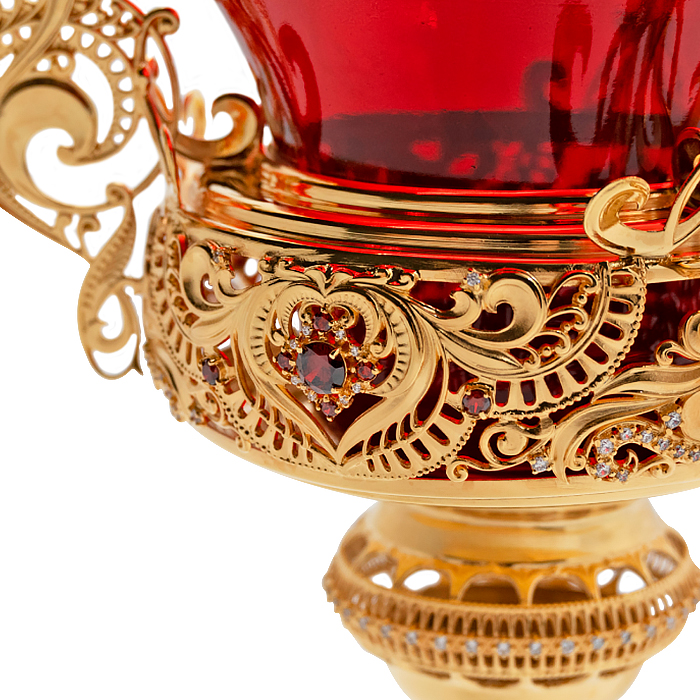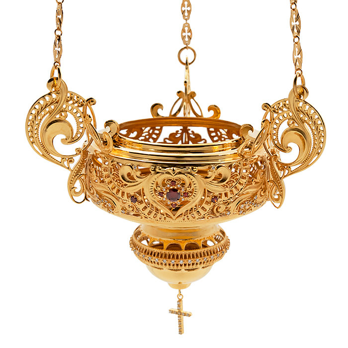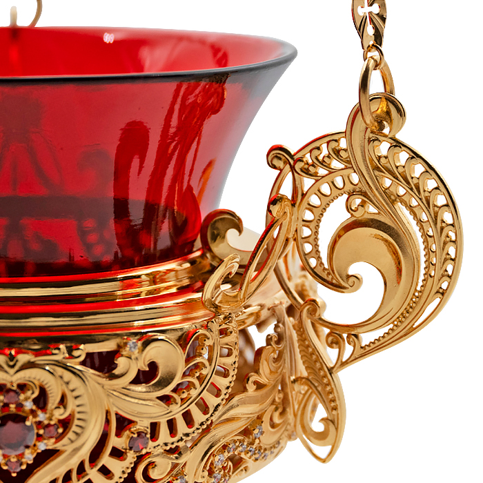 Лампада подвесная из ювелирного сплава в позолоте с камнями.