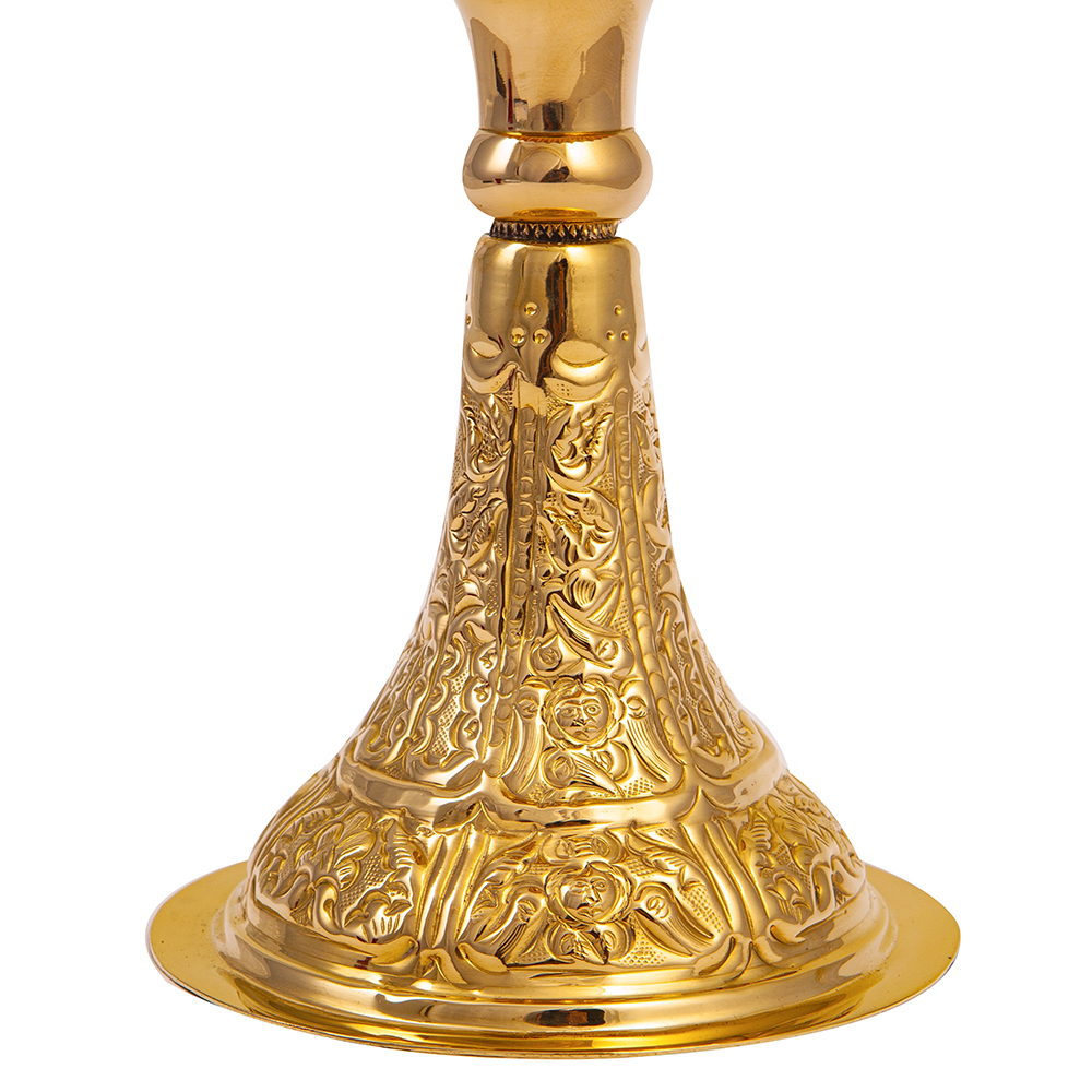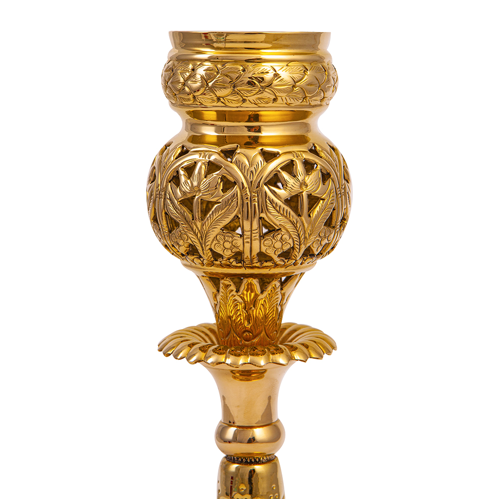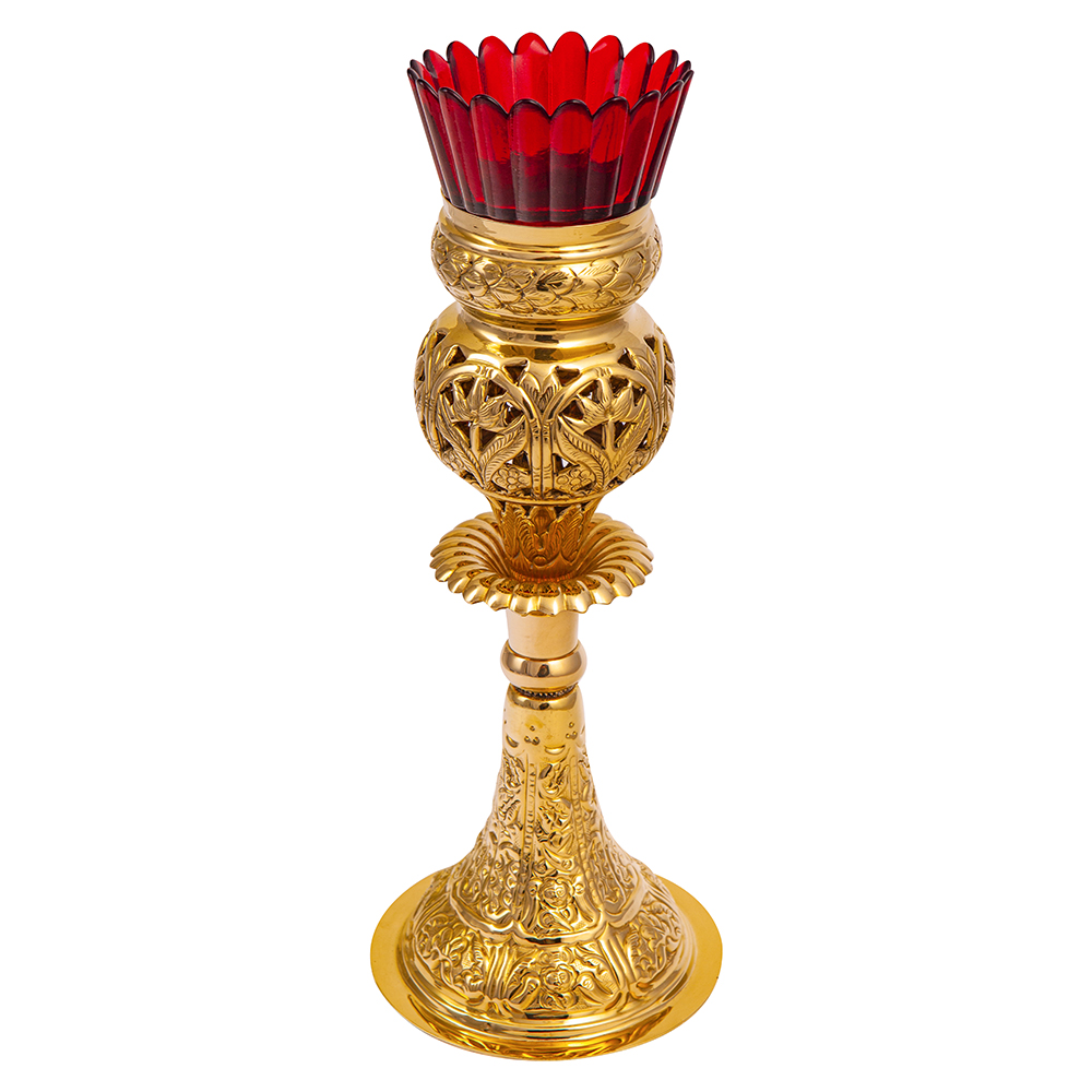 Напрестольная лампада изготовлена из латуни. Конструкцию лаконичной формы украшает рельефный чеканный узор на поверхности основания и круглую вставку в верхней части. Высокая модель лампады украсит пространство храма и придаст богослужению особую торжественность.