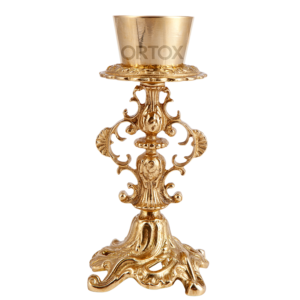 Напрестольная лампада изготовлена из латунного сплава. Покрытие лаком защищает сплав от внешнего воздействия, придает приятный блеск и уменьшает риск потемнения изделия, облегчая уход за ним. Для декорирования корпуса использована технология объемного литья, благодаря которой конструкция получилась визуально легкой и ажурной. Лакированная поверхность не притягивает пыль и легко очищается от загрязнений.