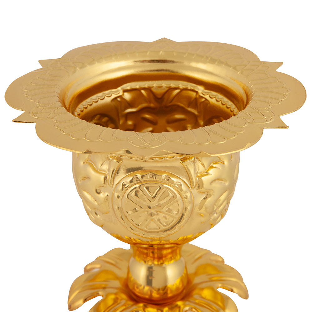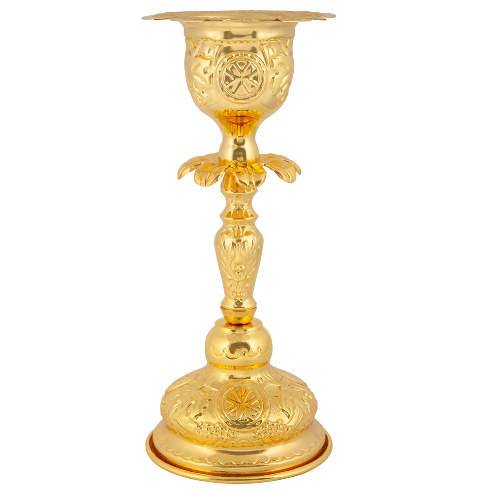 Напрестольная лампада изготовлена из цинкового сплава. Высокая конструкция в виде распустившегося цветка опирается на широкое круглое основание. Поверхность чаши, опоры и основания украшена аккуратным рельефным узором. В стоимость лампады входит стаканчик под масло из стекла.