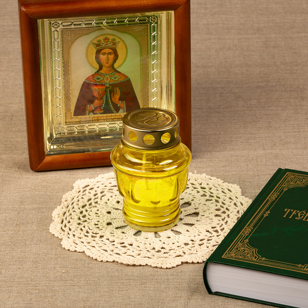 Неугасимая лампада из прочного стекла с заливным слоем парафина и фитилем, с металлической крышкой.