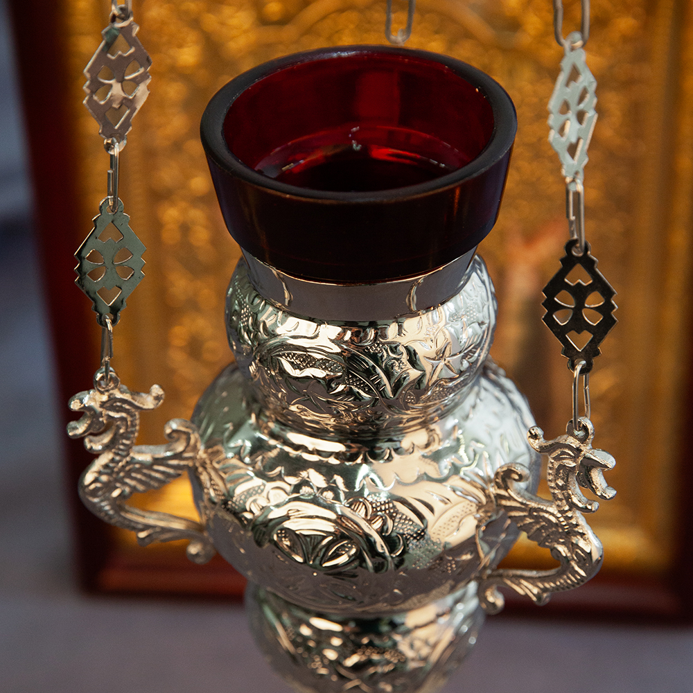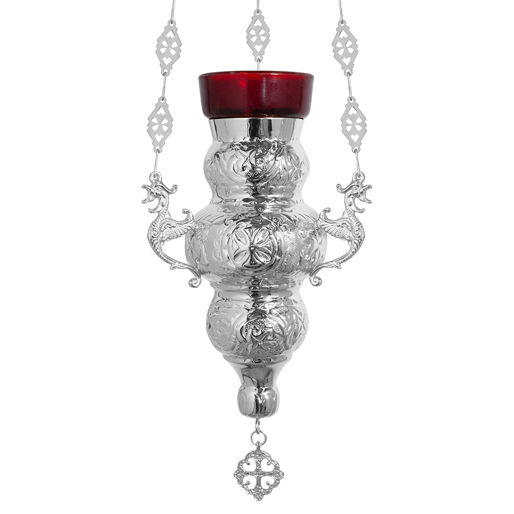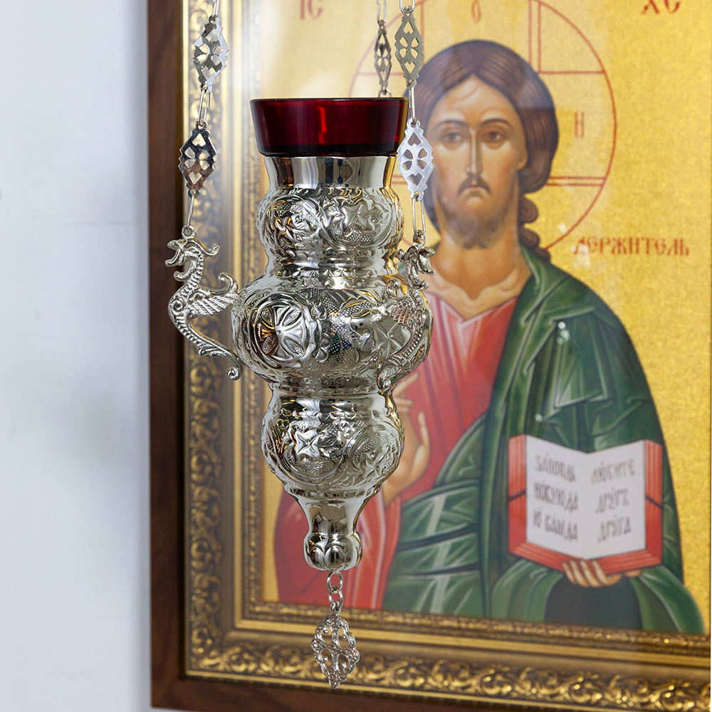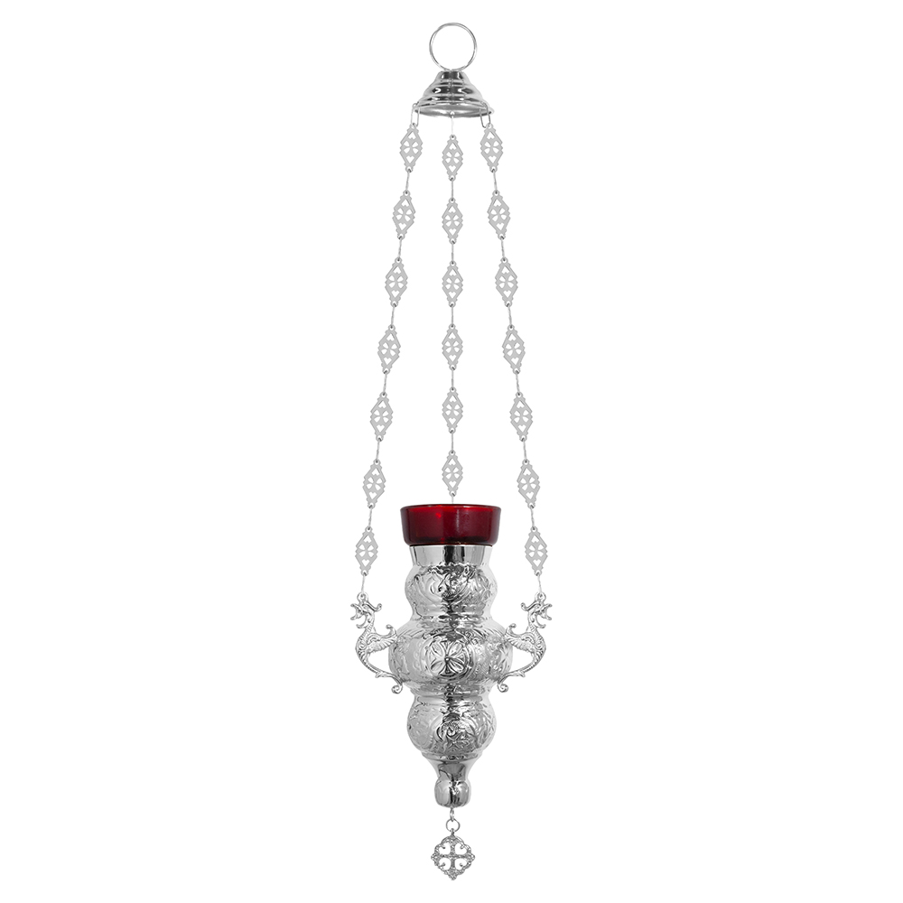 Подвесная лампада изготовлена из латуни. Поверхность изделия украшена узором и обработана по технологии никелирования. Модель необычной фигурной формы напоминает старинную лампу, в нижней части которой имеется подвеска в форме равностороннего креста. С трех сторон на лампаде имеются крючки для подвешивания на цепи, выполненные в виде причудливых мифических животных. Лампада украсит домашний угол с иконами или подсветит особо чтимый образ в интерьере храма.