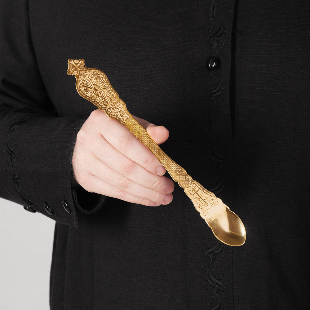Традиционный элемент набора для Евхаристии - классическая латунная лжица, украшенная чеканным орнаментом.