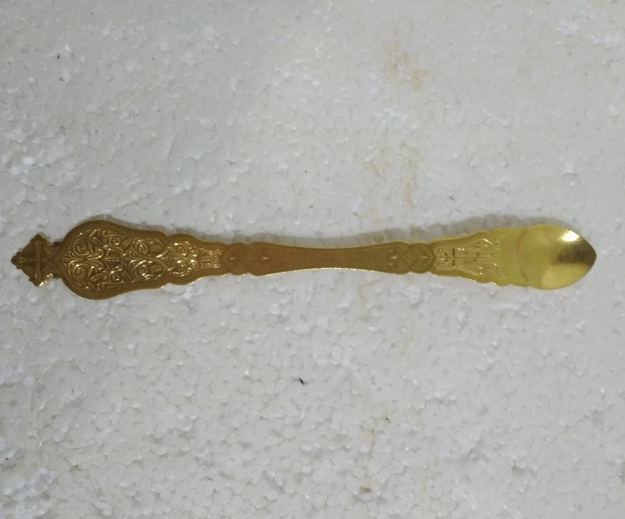 Традиционный элемент набора для Евхаристии - классическая латунная лжица, украшенная чеканным орнаментом.