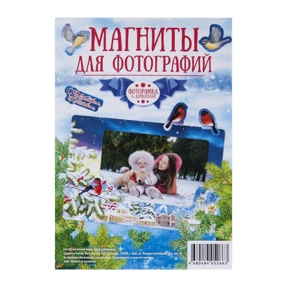Магнитная фоторамка "Снегири" для оформления праздничных рисунков и фотографий. Содержит 5 дополнительных держателей для фото.