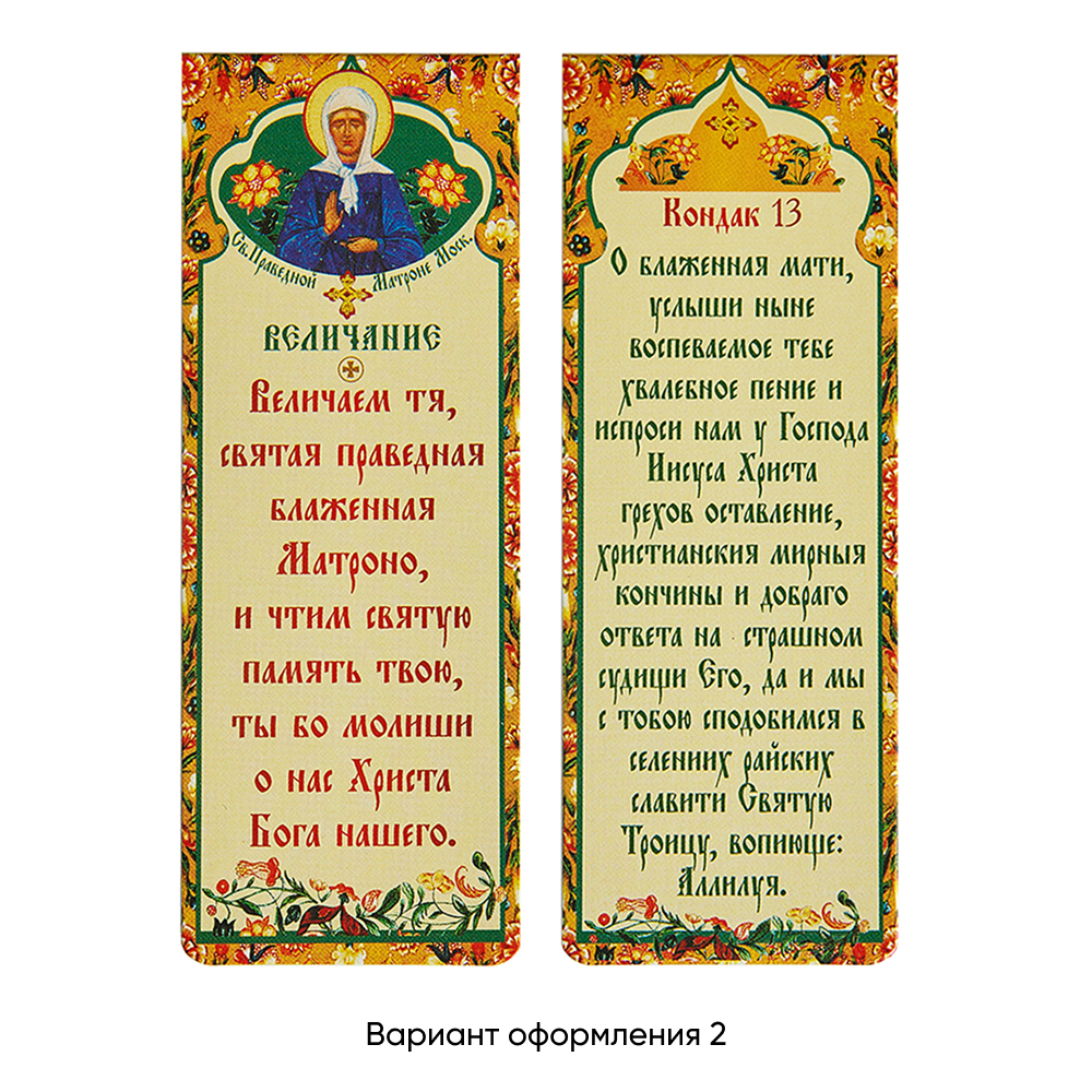 На одной стороне закладки размещен кондак блаженной Матроне Московской, на другой – икона и величание.
