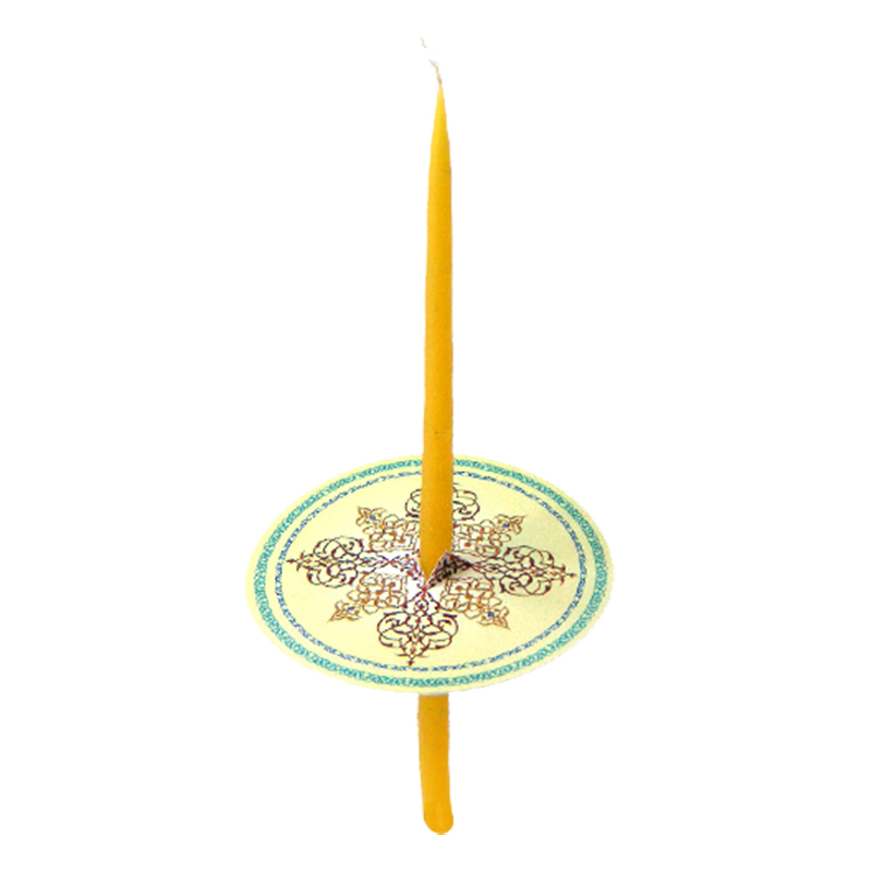Манжета для свечи изготовлена из картона. Изделие предназначено для использования во время продолжительных церковных богослужений и крестных ходов, помогая защитить руки и пол храма от капель воска. Поверхность манжеты украшает оригинальный орнаментальный рисунок.