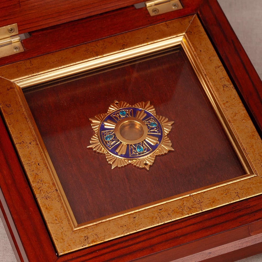 Накладной мощевик изготовлен из ювелирного сплава и покрыт тонким слоем золота гальваническим способом. Такая технология нанесения гарантирует неизменный вид изделия на очень длительный срок. Мощевик декорирован эмалью и вставками фианитов ручной закрепки. Место под частицу диаметром 16 мм, закрыто органическим стеклом.