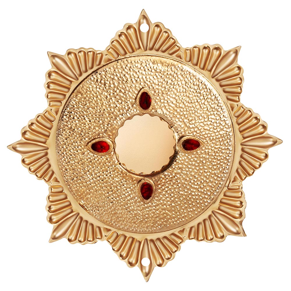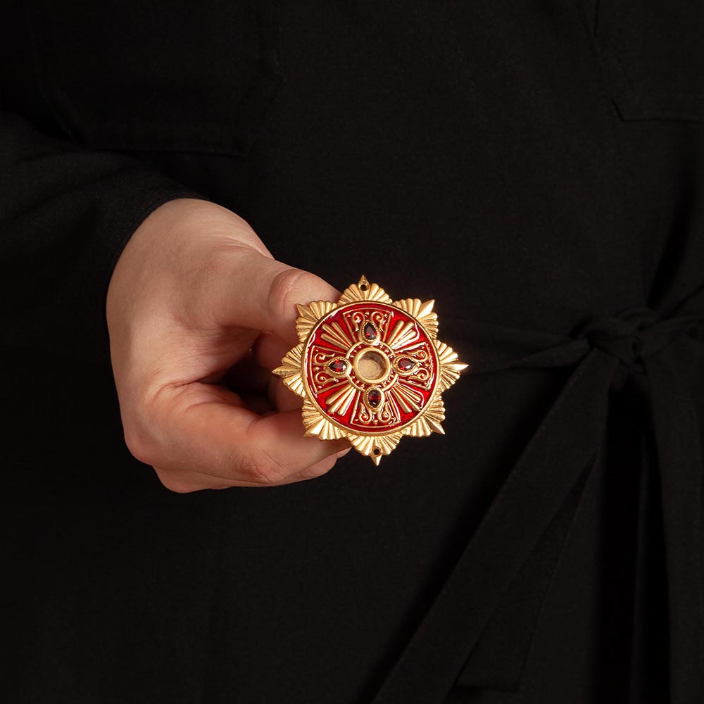 Мощевик накладной из ювелирного сплава в позолоте с красной эмалью и фианитами, Ø 63/16 мм