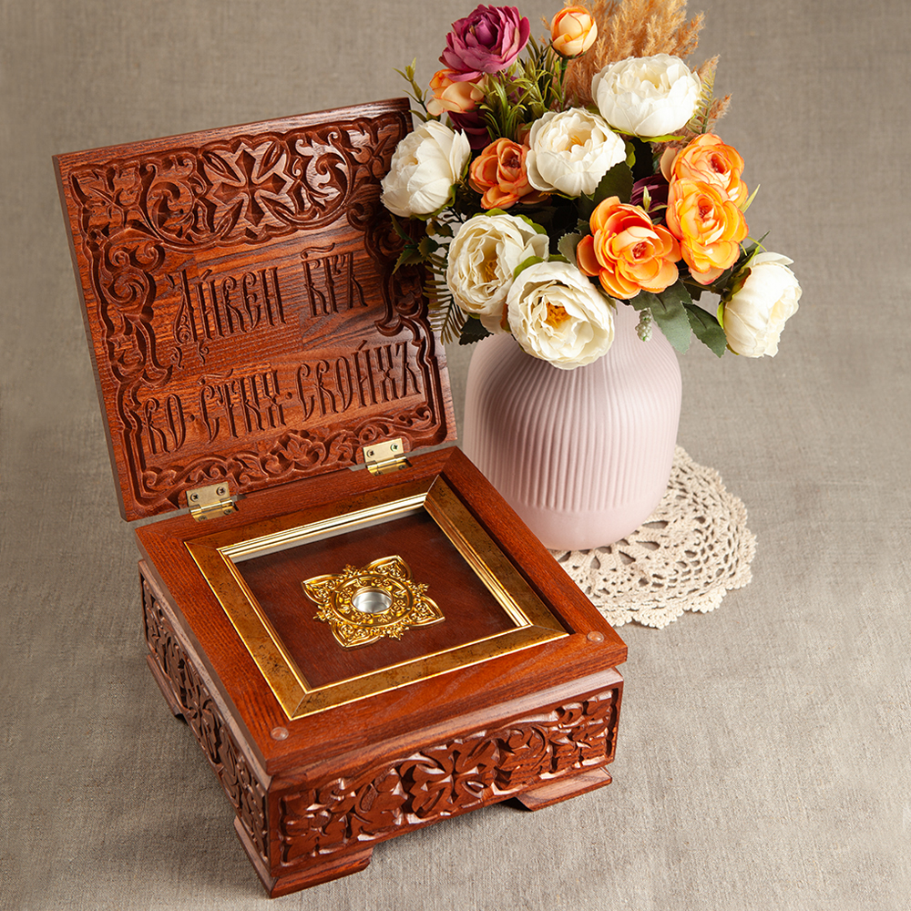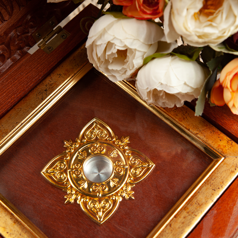Мощевик врезной модели изготовлен из цинкового сплава. Оригинальную четырехстороннюю форму модели подчеркивает ажурный узор. Мощевик украсит ковчег или икону с изображением святого, мощи которого помещены внутри.