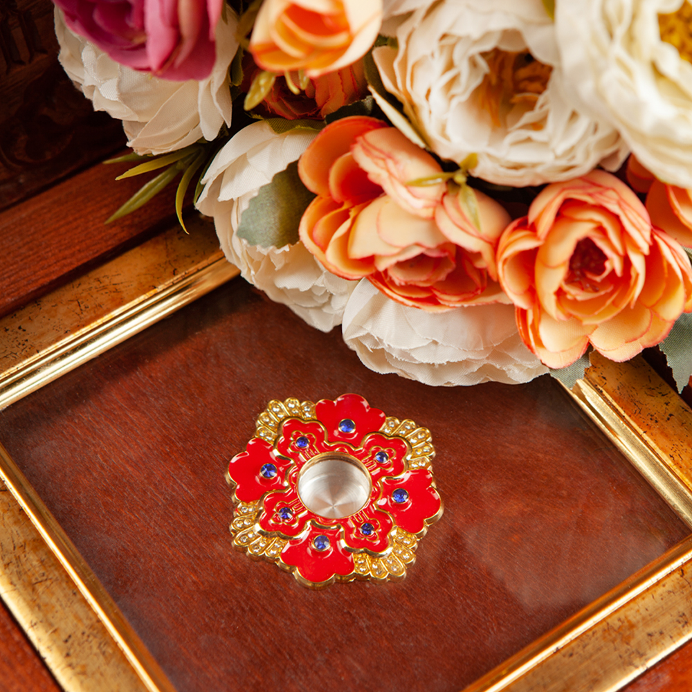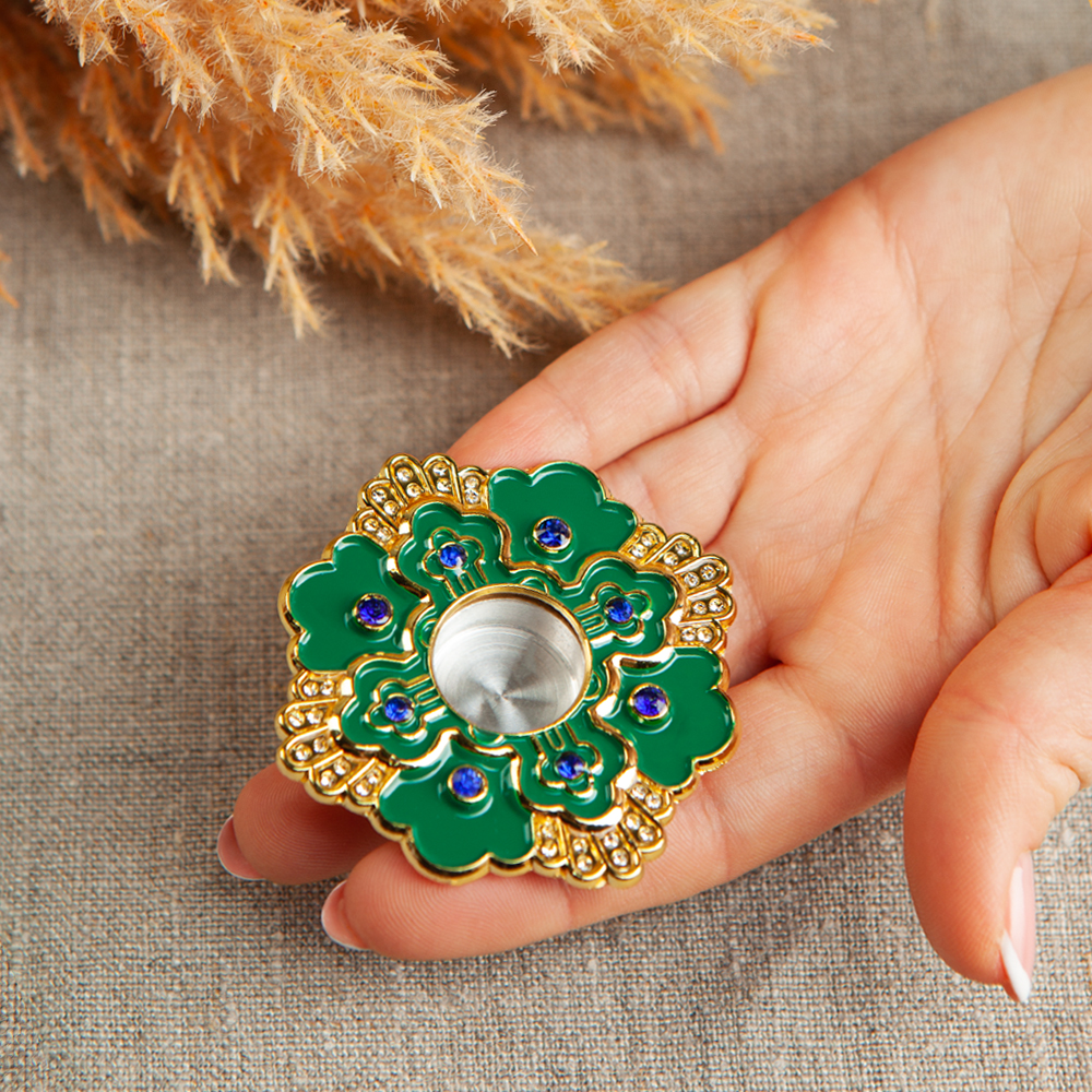 Врезной мощевик из цинкового сплава с цветной эмалью и вставками из камней.