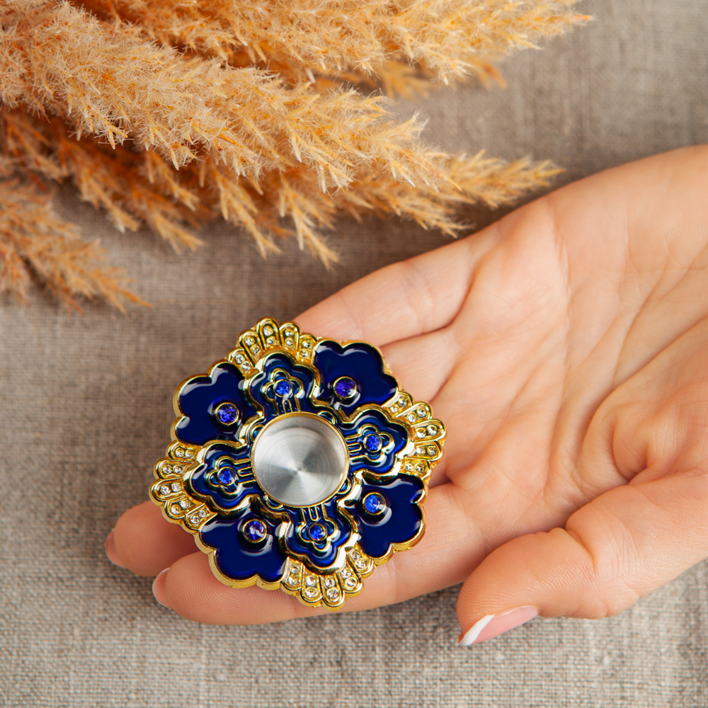 Врезной мощевик оригинальной формы изготовлен из цинкового сплава. Рельеф и рисунок поверхности дополнительно подчеркивает цветная эмаль, на фоне которой выгодно смотрятся контрастные вставки с синими камнями. От основной части изделия отходят "лучи", украшенные парными вставками из мелких камней.