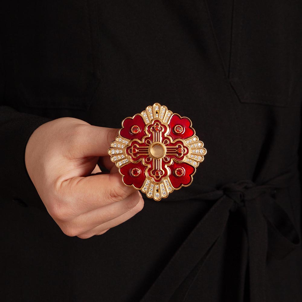 Мощевик накладной из ювелирного сплава в позолоте с эмалью и фианитами.