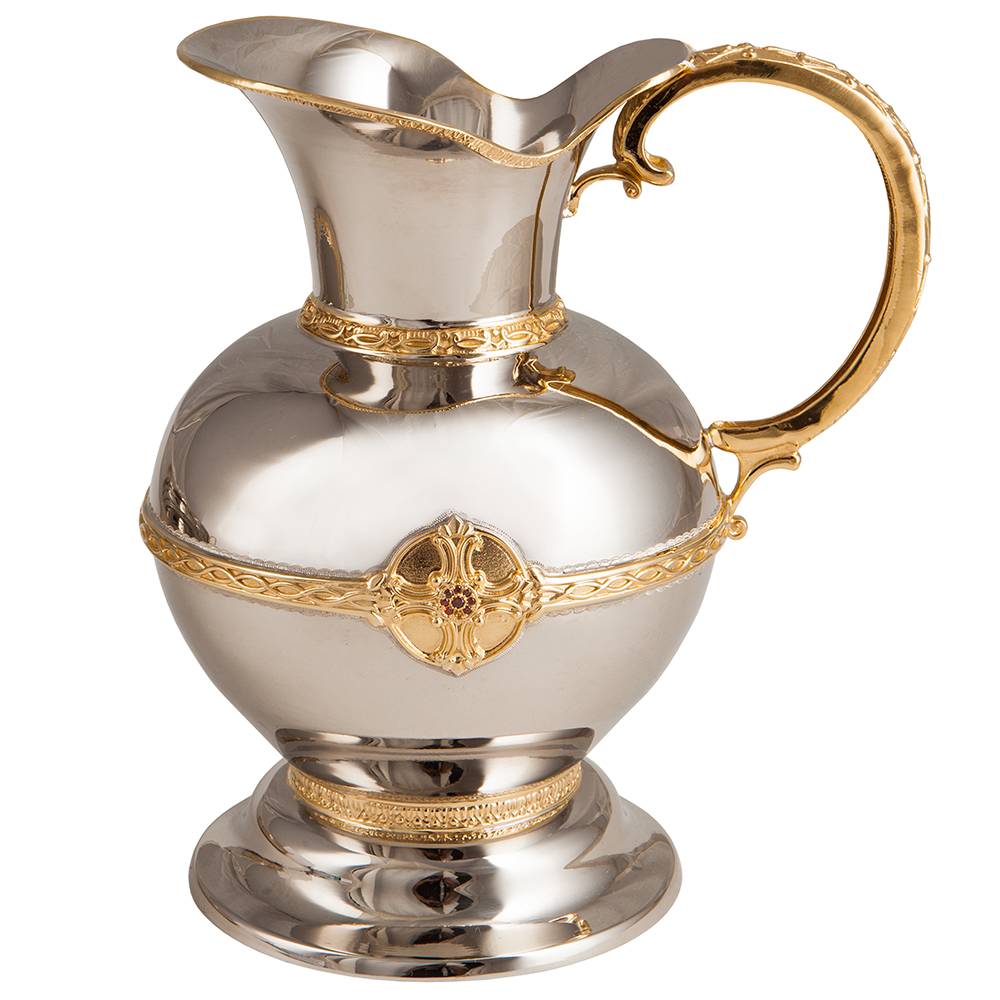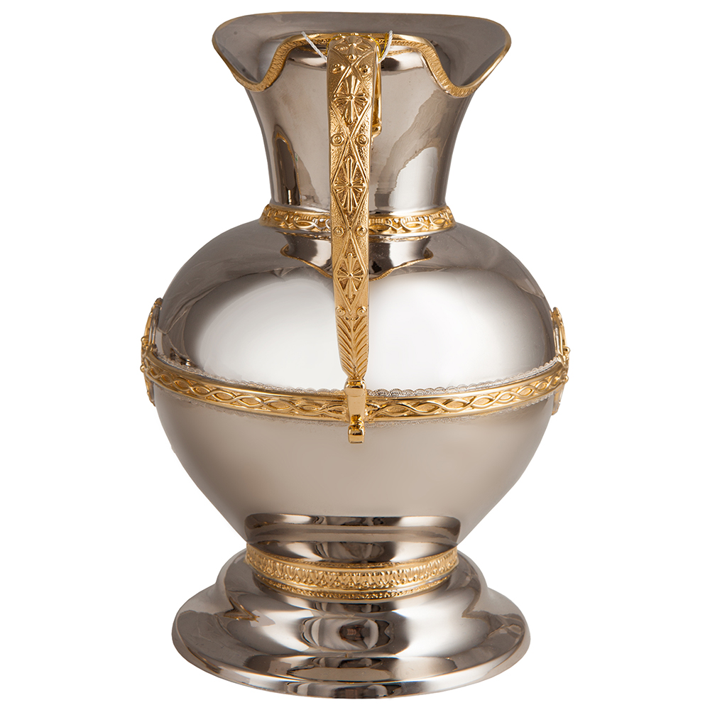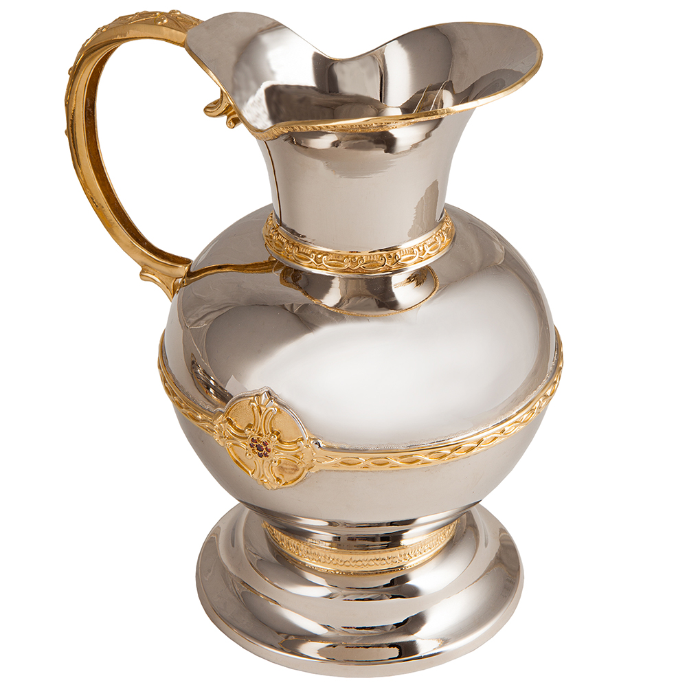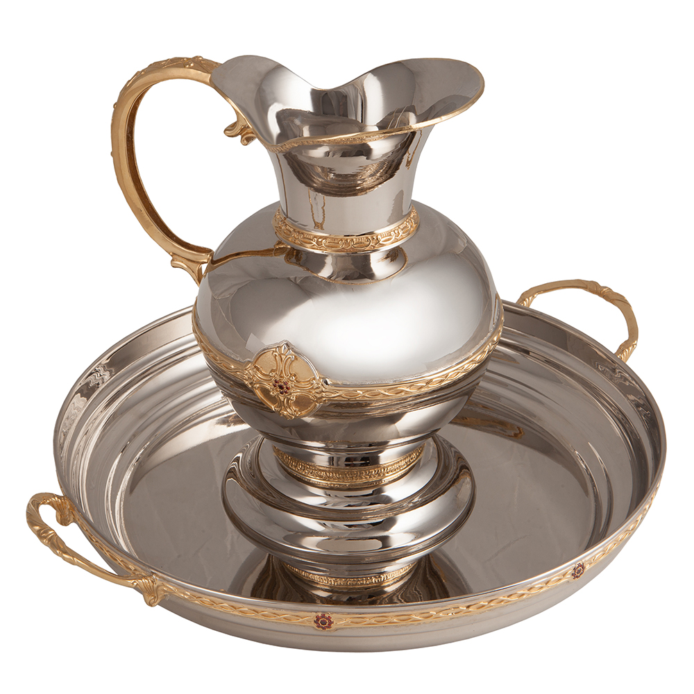 Набор для омовения рук перед совершением богослужений и Таинств изготовлен из качественного ювелирного сплава и покрыт тонким слоем серебра гальваническим методом. В комплекте представлены широкая лохань и кувшин с удобной широкой ручкой, выполненные в едином стиле. В качестве главного украшения использована стойкая позолота, нанесенная на боковую поверхность и край кувшина, а также на верхнюю часть и ручки лохани. Набор станет ценным подарком священнику или архиерею в честь памятной даты или на освящение храма.