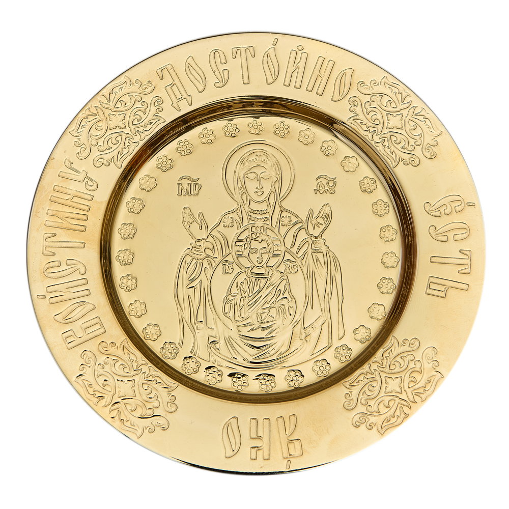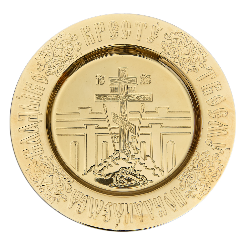 Набор тарелочек изготовлен из качественного ювелирного сплава. На поверхность изделий нанесен стойкий слой позолоты. Изображения и слова молитв, украшающие лицевую сторону тарелочек, выполнены по технологии травления. Комплект станет ценным вкладом в благоустройство храма и достойным подарком иерею к памятной дате.