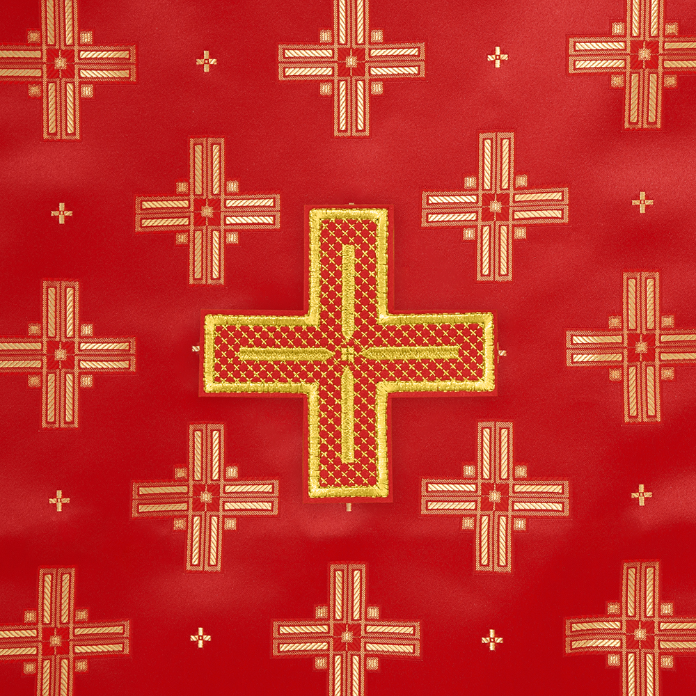 Перекидная накидка на аналой сшита из плотного шелка «Святительский» на основе волокон полиэфира. Для отделки использованы тесьма и бахрома. Накладной крест вышит на машинке. Цвета материала для пошива выбраны согласно принятой символике богослужебных облачений.