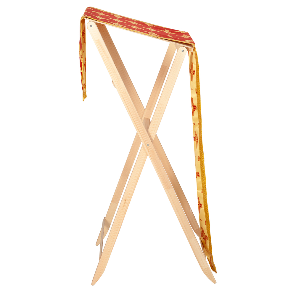 Перекидная накидка на аналой сшита из жаккардовой ткани «Святительская». Для отделки использована бахрома. Накладной крест вышит на машинке.