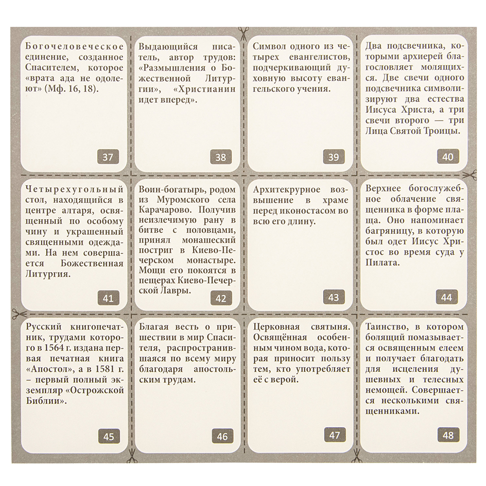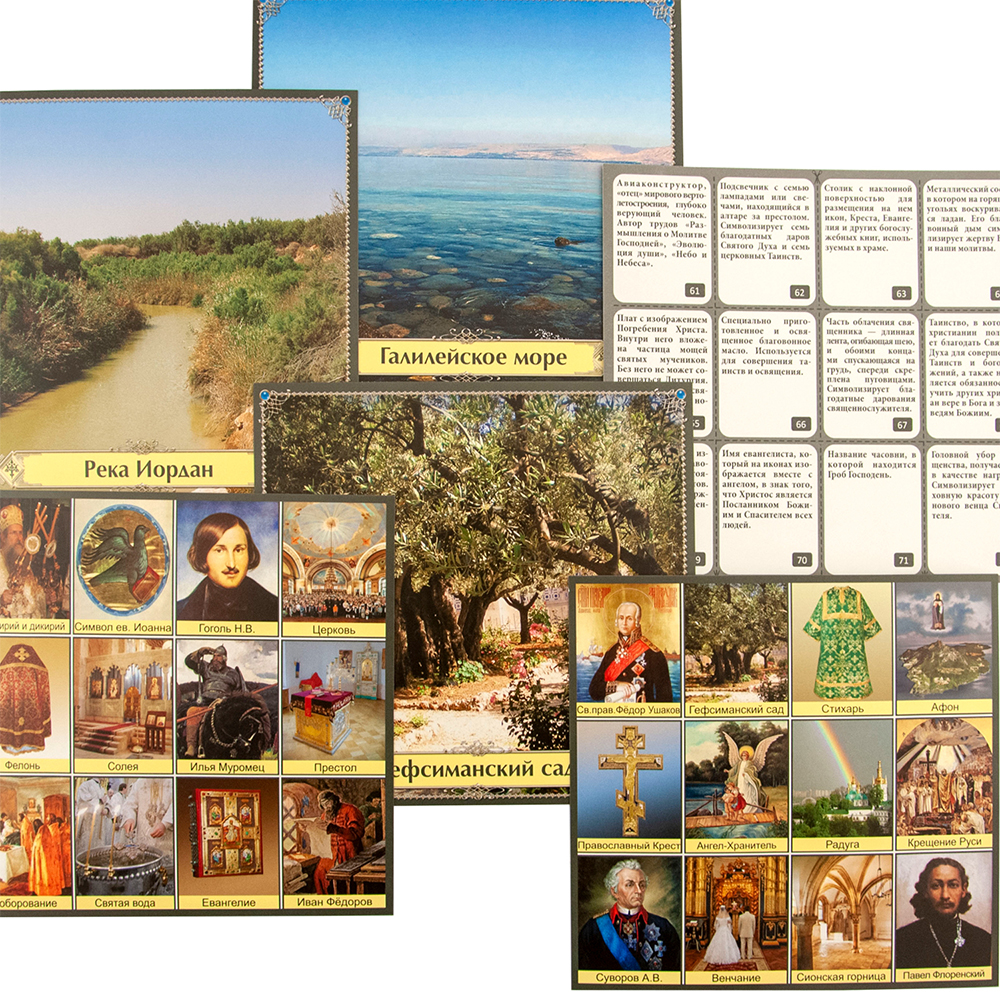 Увлекательная игра подойдет как для интересного времяпрепровождения в теплом семейном кругу, так и в воскресной школе или на уроках ОПК в образовательных учреждениях. Карточки с яркими картинками расскажут об интересных фактах из области религии и культуры, выдающихся деятелях, православной символике, таинствах Церкви и т.д. Так, играючи, дети и взрослые смогут усвоить основные темы, связанные с православием и повысят эрудицию.