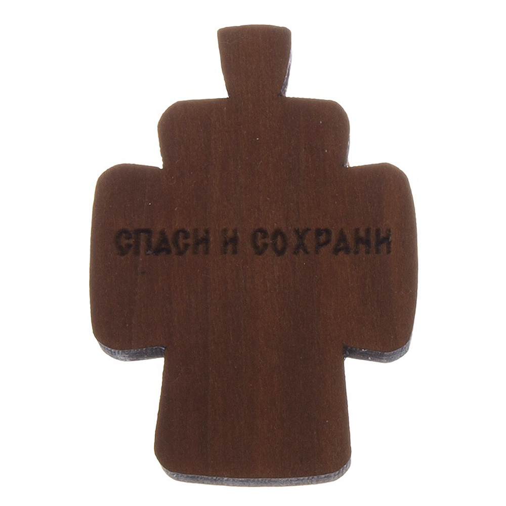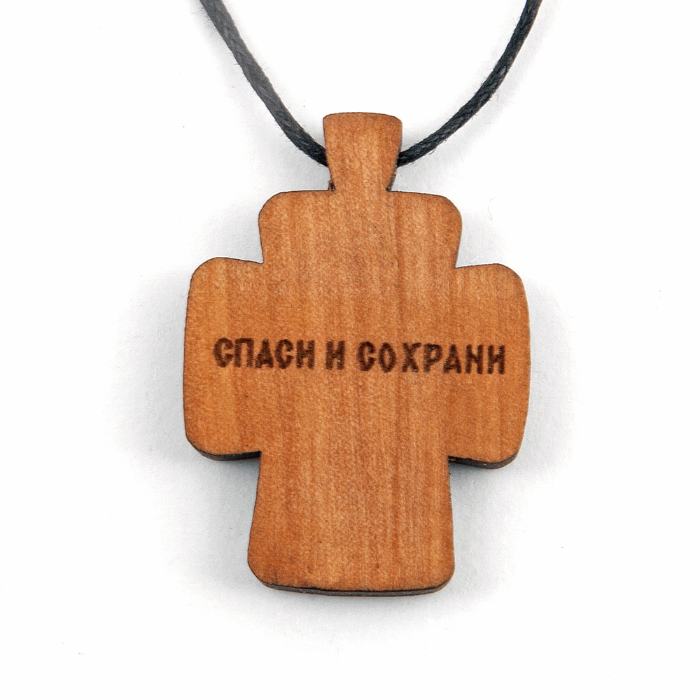 Нательный крест изготовлен из твердой древесины груши. Центральную часть изделия заполняет объемное изображение Распятия из мельхиора, уложенное на деревянную основу с надписью "Спаси и сохрани" на обратной стороне. По кромке элемента предусмотрена широкая рамка, заполненная орнаментальным растительным узором. Для защиты сплава от потемнения выполнено его серебрение.