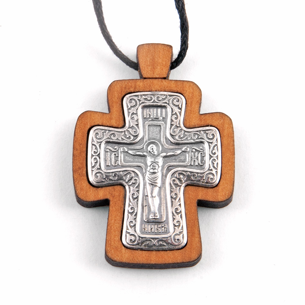 Нательный крестик сделан из благородного и твердого дерева - груши и пропитан натуральными маслами. Распятие изготовлено из мельхиора и покрыто серебрением.