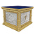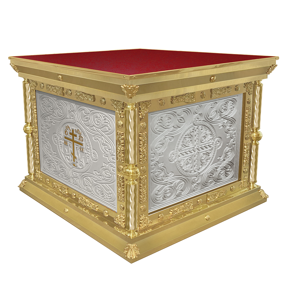 Облачение на престол серии «Елеонская» изготовлено из искусственного камня и металла. Для украшения использованы литые декоративные накладки и резьба по камню, фрагменты которой выделены поталью. Поверхность столешницы закрыта мебельной тканью в трех цветах богослужебных облачений. При оформлении заказа на изготовление облачения укажите желаемые размеры и цвет отделки столешницы, выбрав любой подходящий из нескольких доступных вариантов.