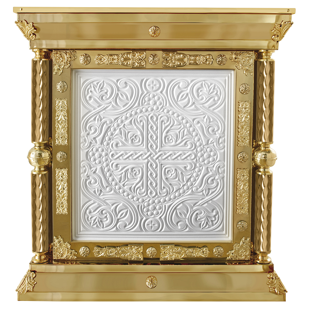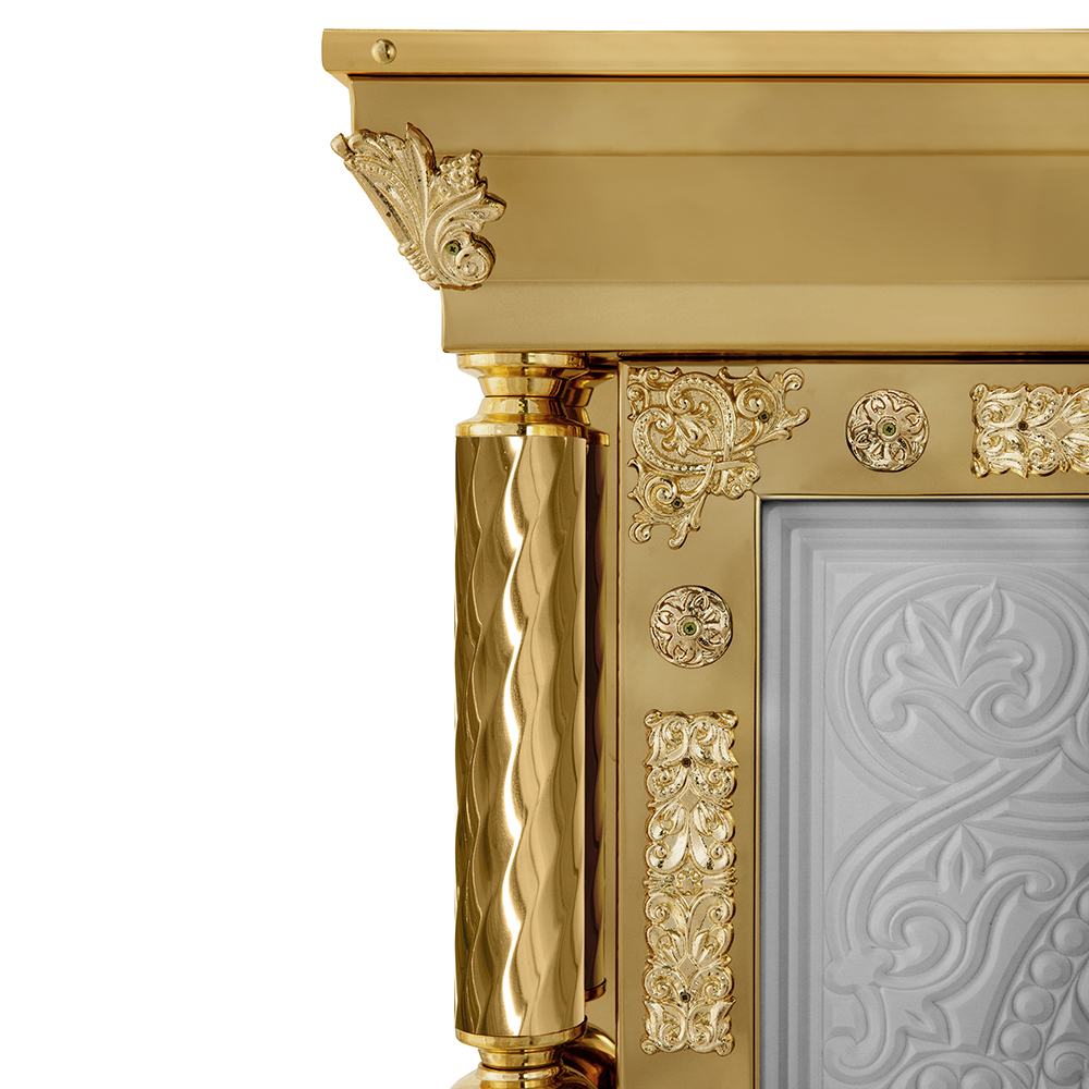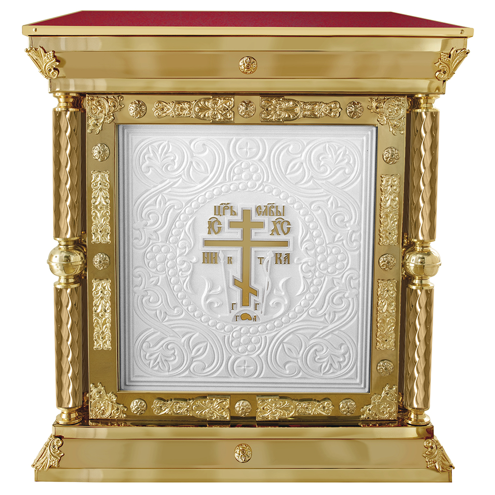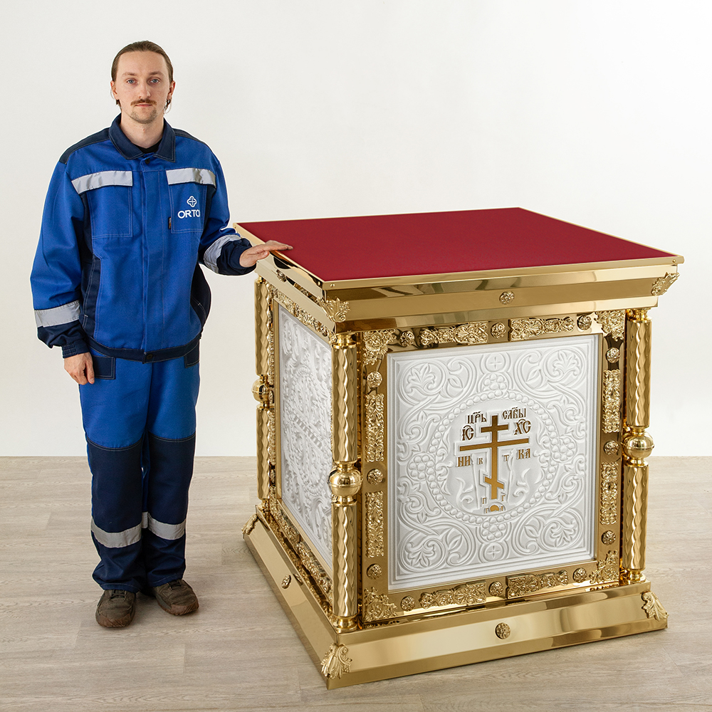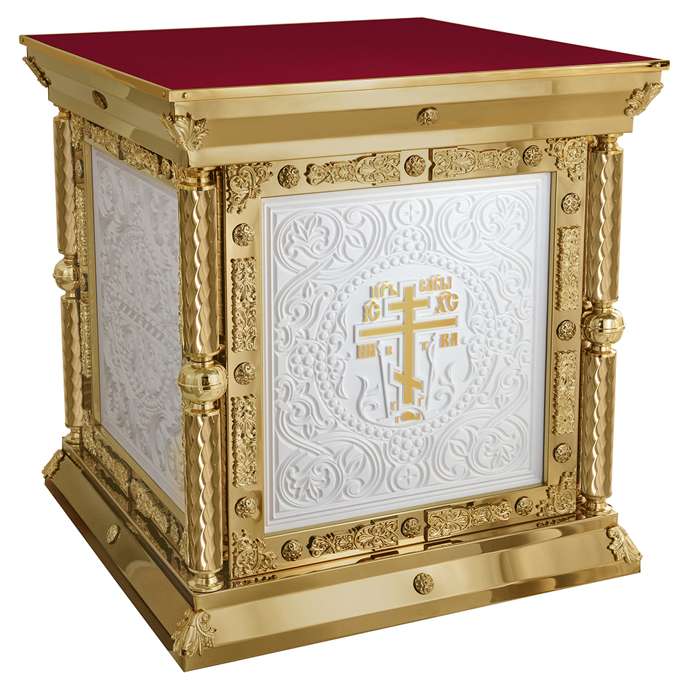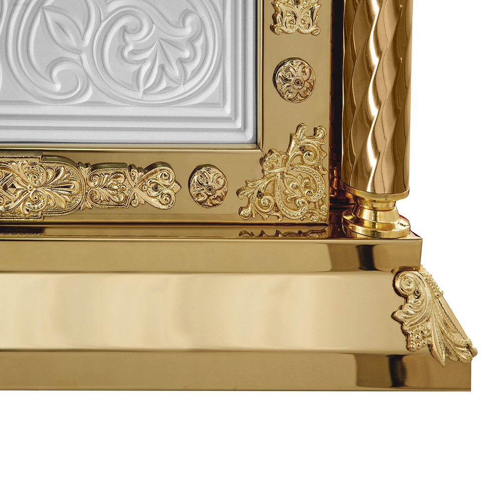 Облачение на престол серии «Елеонская» изготовлено из искусственного камня и металла. Для украшения использованы литые декоративные накладки и резьба по камню, фрагменты которой выделены поталью. Поверхность столешницы закрыта мебельной тканью в трех цветах богослужебных облачений. При оформлении заказа на изготовление облачения укажите желаемые размеры и цвет отделки столешницы, выбрав любой подходящий из нескольких доступных вариантов.