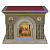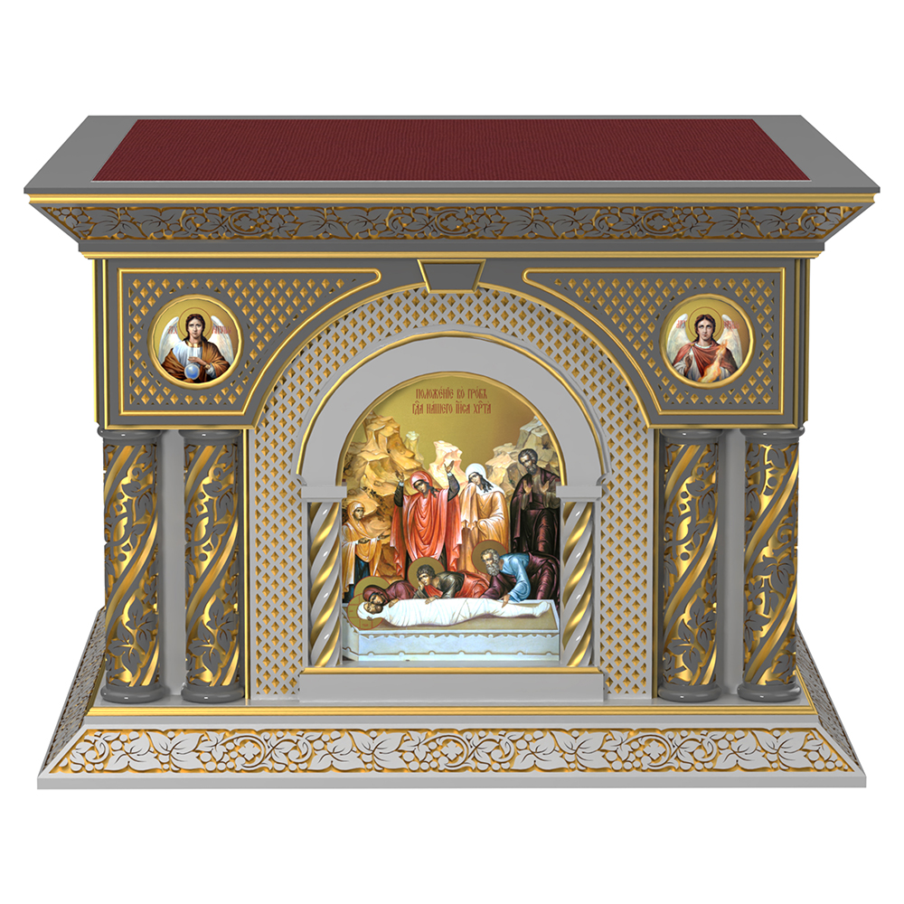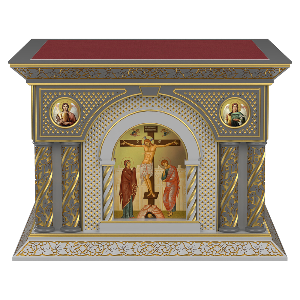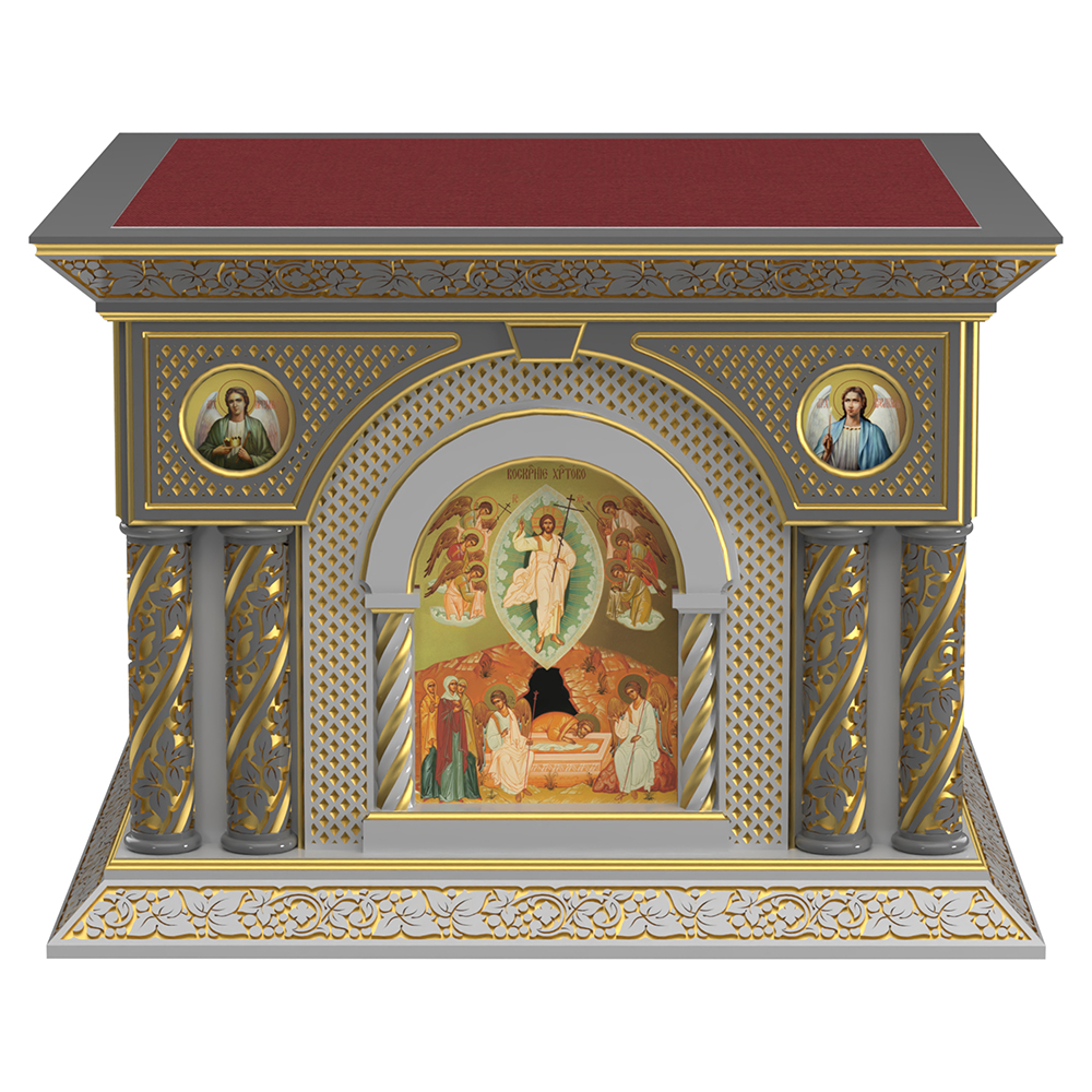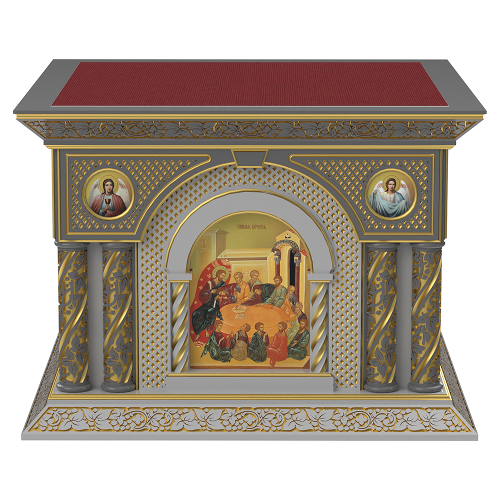 Облачение на престол «Романовское» из натуральной древесины ясеня в темно-сером цвете с декоративной резьбой, покрытием по технологии патинирования и цветными иконами в арочных нишах, дополненными резными колоннами.