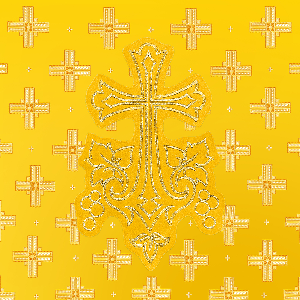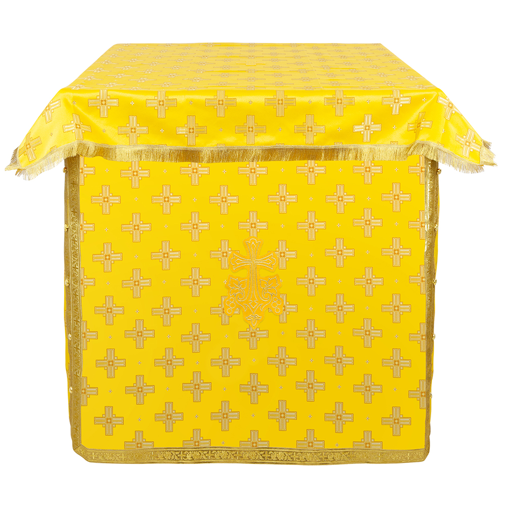 Облачение на престол в цвете «желтый с золотом» из искусственного шелка «Святительский» на основе полиэфира с отделкой галуном, накладным крестом, бахромой и застежкой на пуговицы.