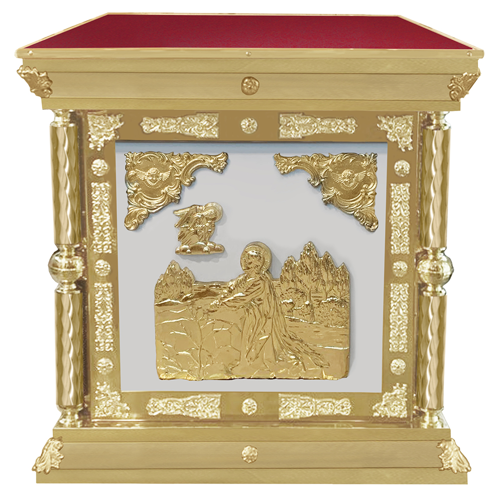 Облачение на престол серии «Сионская» изготовлено из металлического сплава и искусственного камня. В качестве отделки использованы декоративные накладки, изготовленные методом литья. Столешница закрыта плотной мебельной тканью. При оформлении заказа на изготовление облачения «Сионское» отметьте желаемые размеры и цвет отделки поверхности, выбрав подходящий из нескольких доступных вариантов.