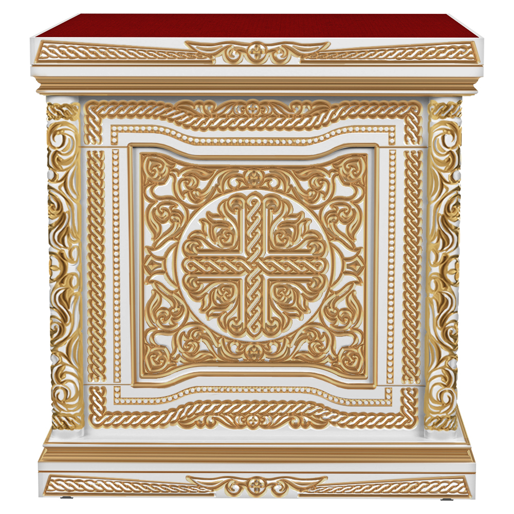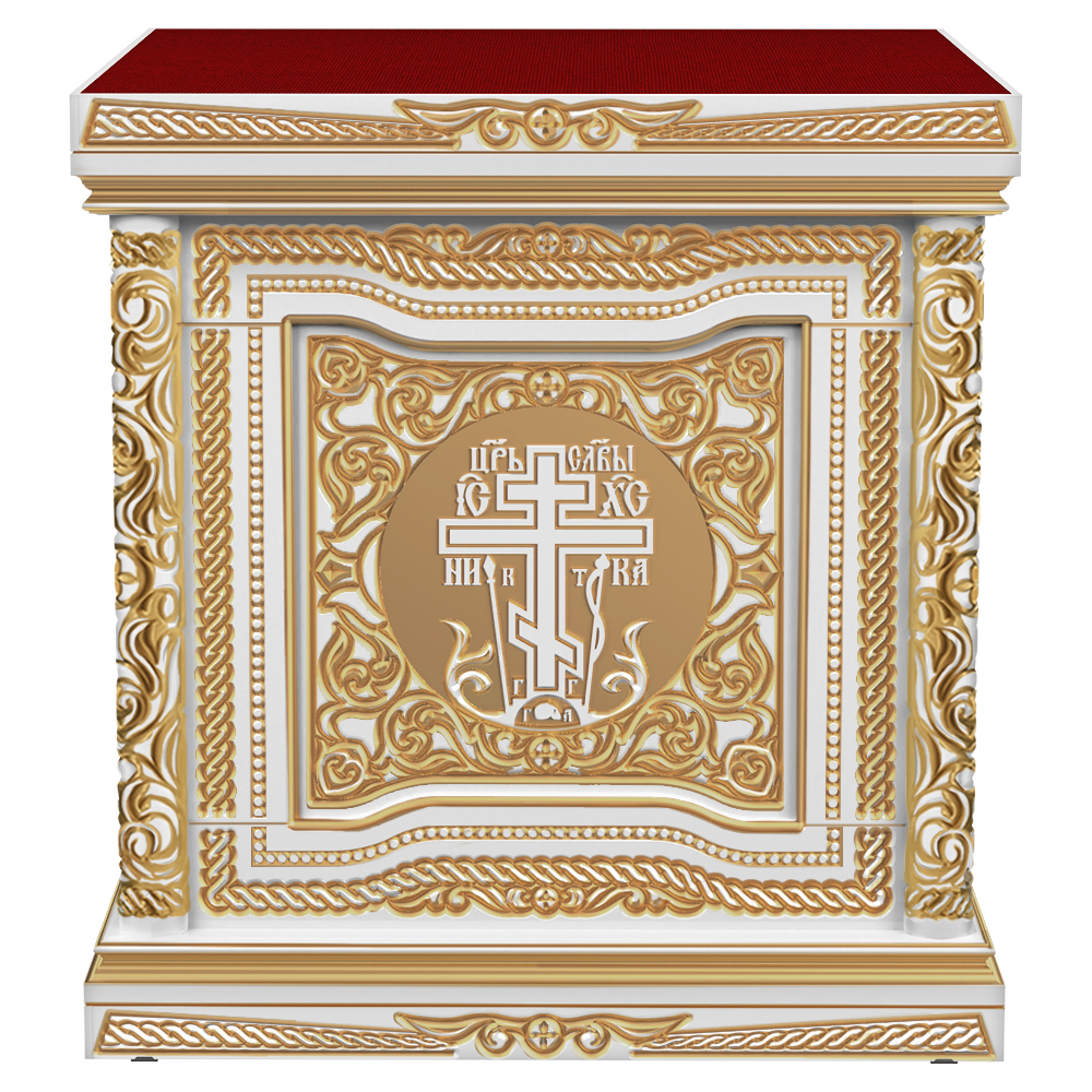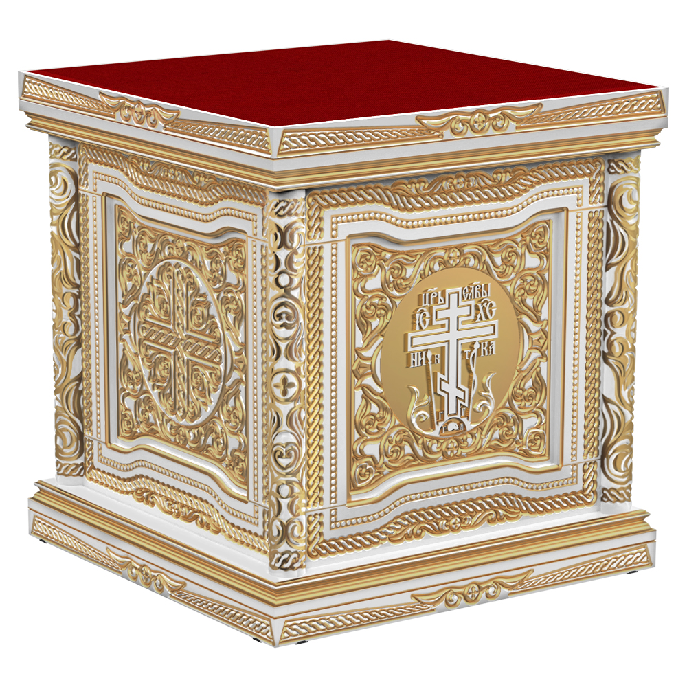 Облачение на престол серии «Вологодская» изготовлено из натуральной древесины: основные элементы вырезаны из ясеня, для вспомогательных деталей использована сосна. Основные поверхности конструкции богато украшены декоративной резьбой. Для отделки столешницы использована мебельная ткань. При оформлении заказа на изготовление конструкции укажите ее размер, а также желаемый цвет.