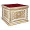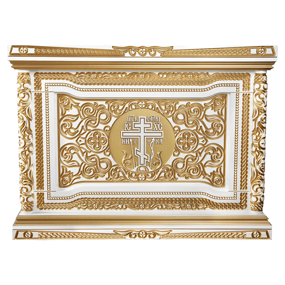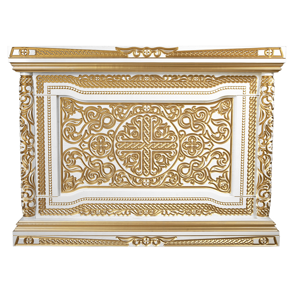 Облачение на престол серии «Вологодская» изготовлено из натуральной древесины: основные элементы вырезаны из ясеня, для вспомогательных деталей использована сосна. Основные поверхности конструкции богато украшены декоративной резьбой. Для отделки столешницы использована мебельная ткань. При оформлении заказа на изготовление конструкции укажите ее размер, а также желаемый цвет.