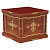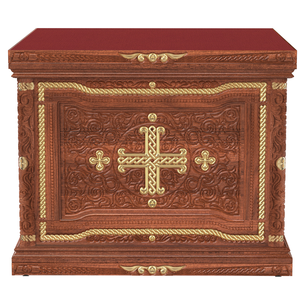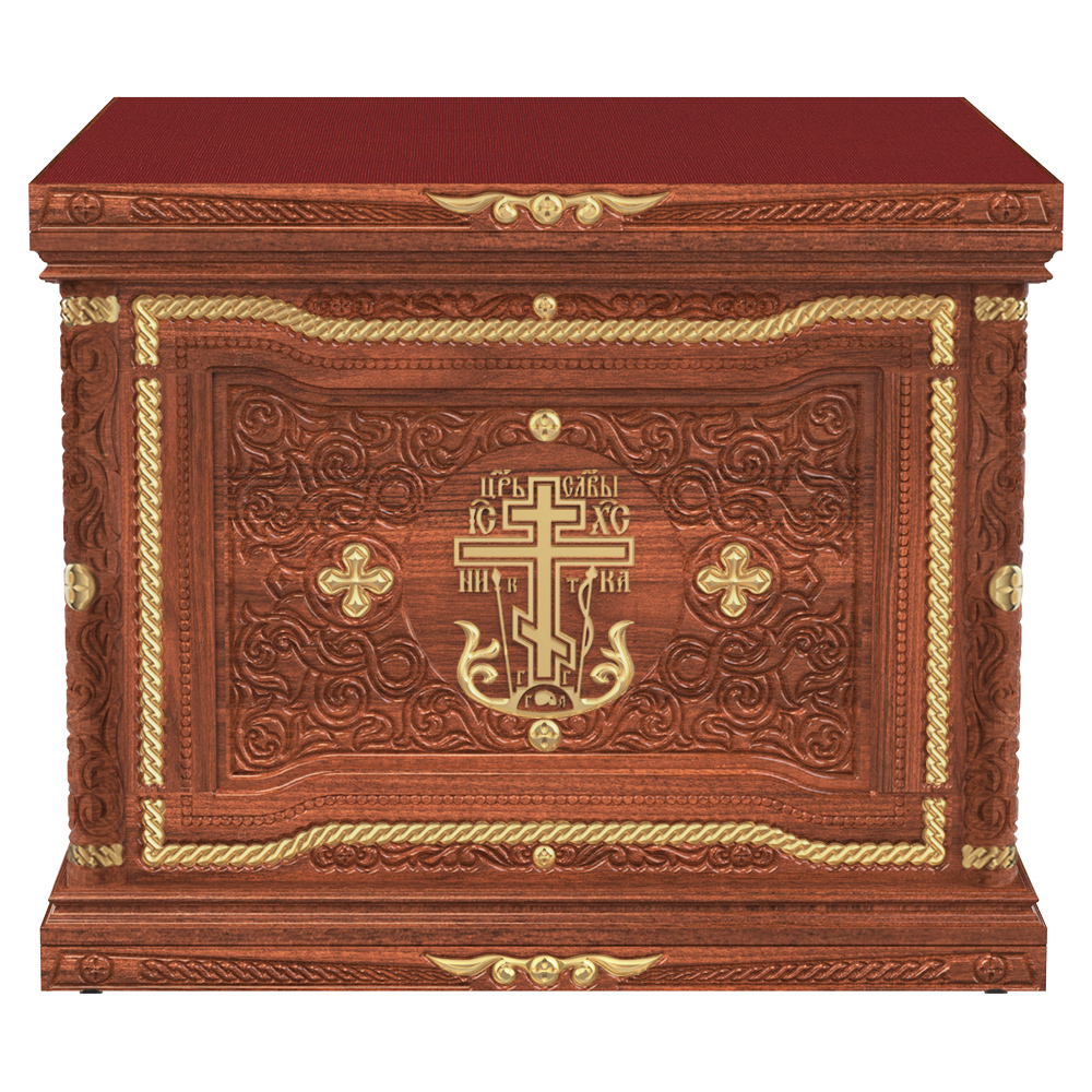 Облачение на престол серии «Вологодская» изготовлено из натуральной древесины: основные элементы вырезаны из ясеня, для вспомогательных деталей использована сосна. Основные поверхности конструкции богато украшены декоративной резьбой. Для отделки столешницы использована мебельная ткань. При оформлении заказа на изготовление конструкции укажите ее размер, а также желаемый цвет.