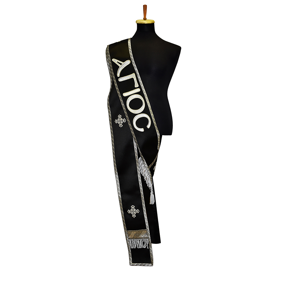 Двойной протодиаконский орарь сшит из атласного шелка. В качестве отделки использованы вышивка "Агиос", цветной галун по периметру и витая бахрома на концах, пришитая под поперечные полосы галуна. Нашивные кресты выполнены с помощью машинной вышивки метанитом на замше. Предусмотрен пошив изделия из ткани любого цвета согласно принятой традиции изготовления богослужебных облачений для праздников и постных периодов года. При заказе необходимо указать рост, цвет ткани и индивидуальные пожелания.