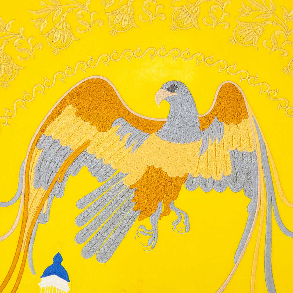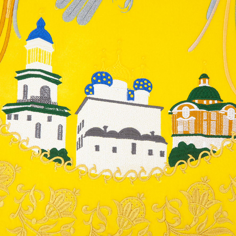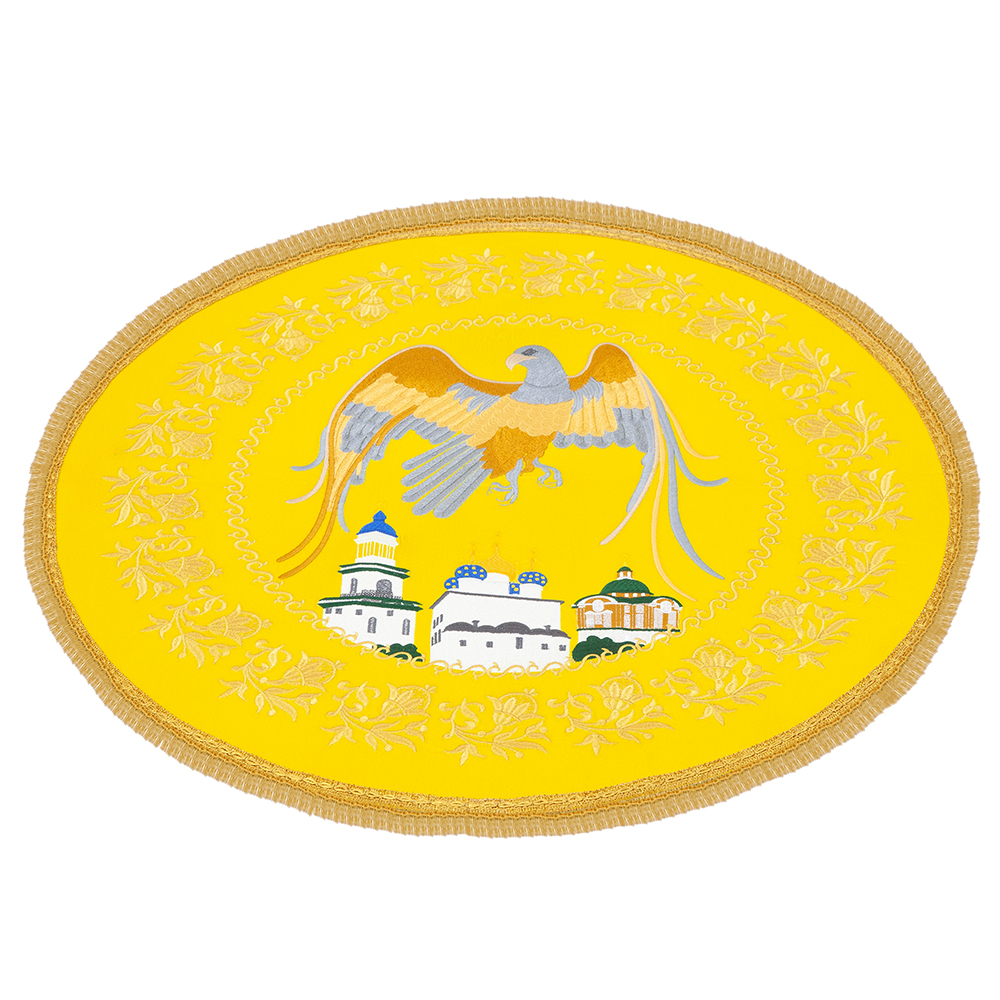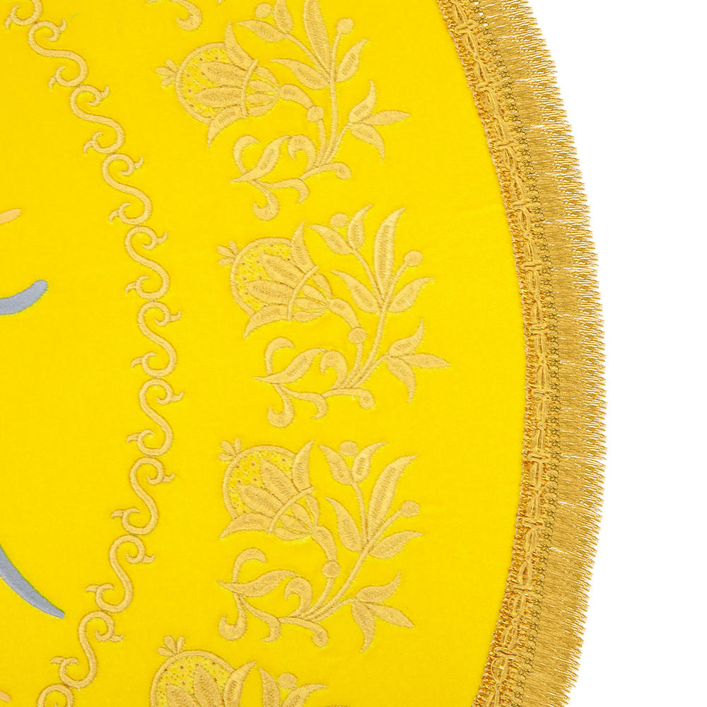 Желтый орлец из бархата на фильце с отделкой металлизированной бахромой и цветной машинной вышивкой для архиерейских богослужений.