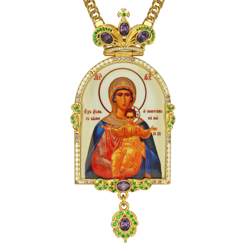 Панагия изготовлена из ювелирного сплава и покрыта тонким слоем золота гальваническим способом. Образ изготовлен по специальной технологии нанесения цветного изображения на основу из ювелирного сплава,оно покрыто составом, предохраняющим икону от механических повреждений и воздействия света. По заказу образ может быть любым. Икону по всему периметру украшает дорожка из фианитов отменного качества, закрепленных вручную. Такая технология гарантирует, что камни не будут выпадать.