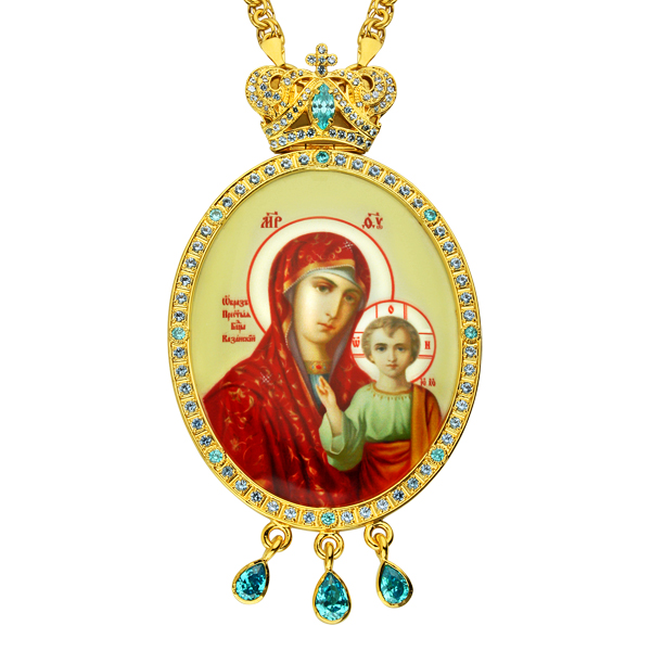 Архиерейская панагия изготовлена из ювелирного сплава и покрыта тонким слоем золота гальваническим способом. Такая технология обеспечивает неизменный вид изделия на очень долгое время. Образ выполнен по специальной технологии нанесения цветного изображения на основу из ювелирного сплава и покрыт составом, предохраняющим его от механических повреждений и воздействия света. По заказу образ может быть любым. Икона окружена дорожкой из качественных фианитов ручной закрепки.