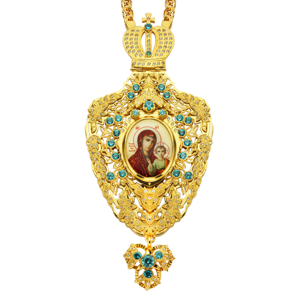 Панагия из ювелирного сплава в позолоте с цепью, белые и голубые фианиты, высота 15 см