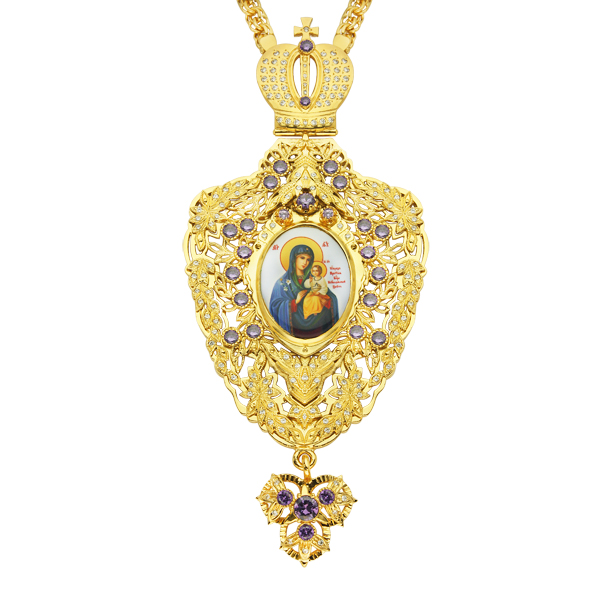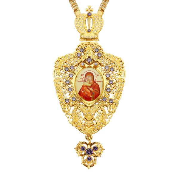 Архиерейская панагия изготовлена из ювелирного сплава и покрыта тонким слоем золота гальваническим способом. Такая технология обеспечивает неизменный вид изделия на очень долгое время. Образ выполнен по специальной технологии нанесения цветного изображения на основу из ювелирного сплава и покрыт составом, предохраняющим его от механических повреждений и воздействия света. По заказу образ может быть любым. Образ обрамляет рамка в виде сплетения растительного орнамента, сплошь покрытого россыпью вставками фианитов отменного качества. Все камни закреплены вручную, что гарантирует их постоянное нахождение на своих местах.